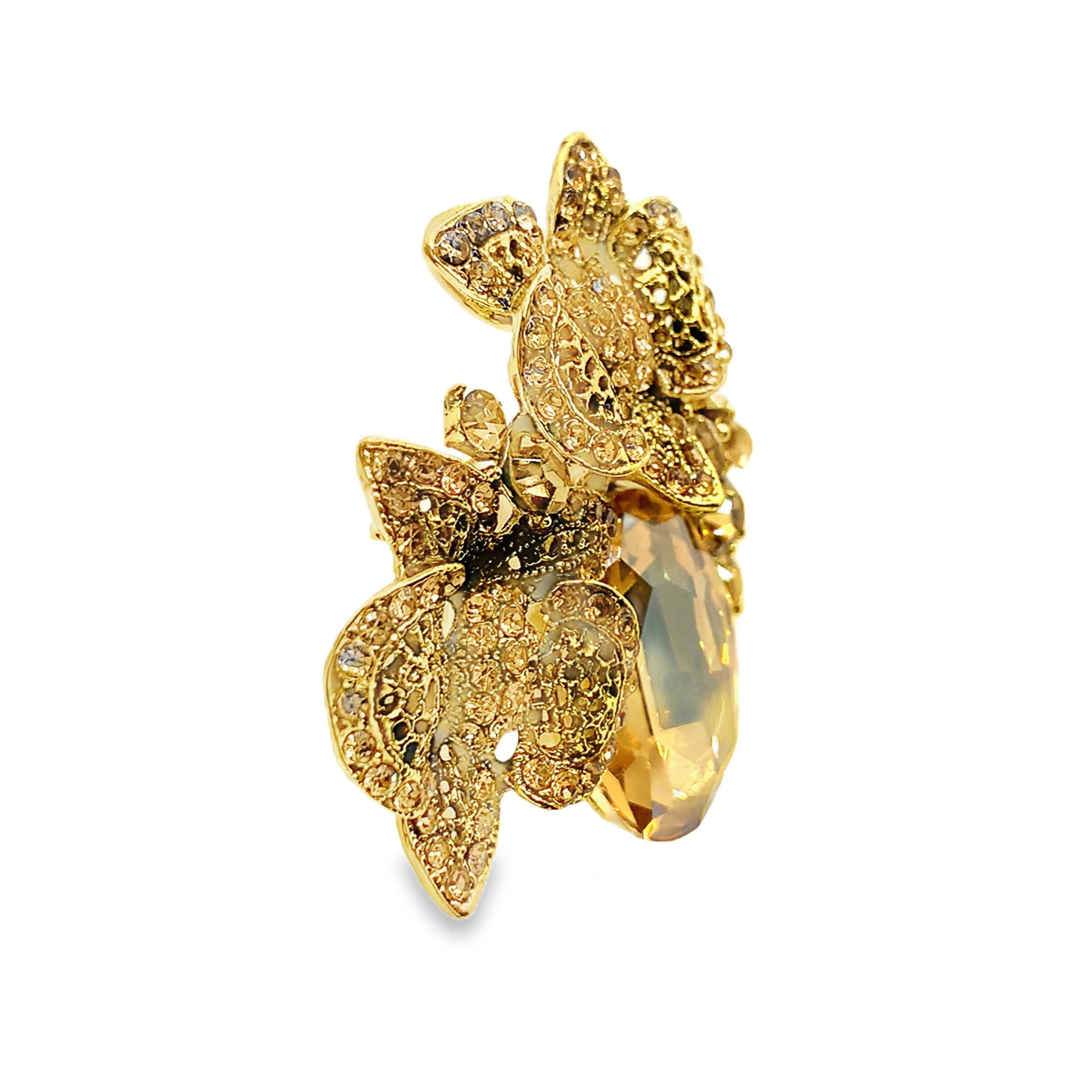 Pozłacana broszka statement kwiatowa w stylu vintage z żółtym kamieniem