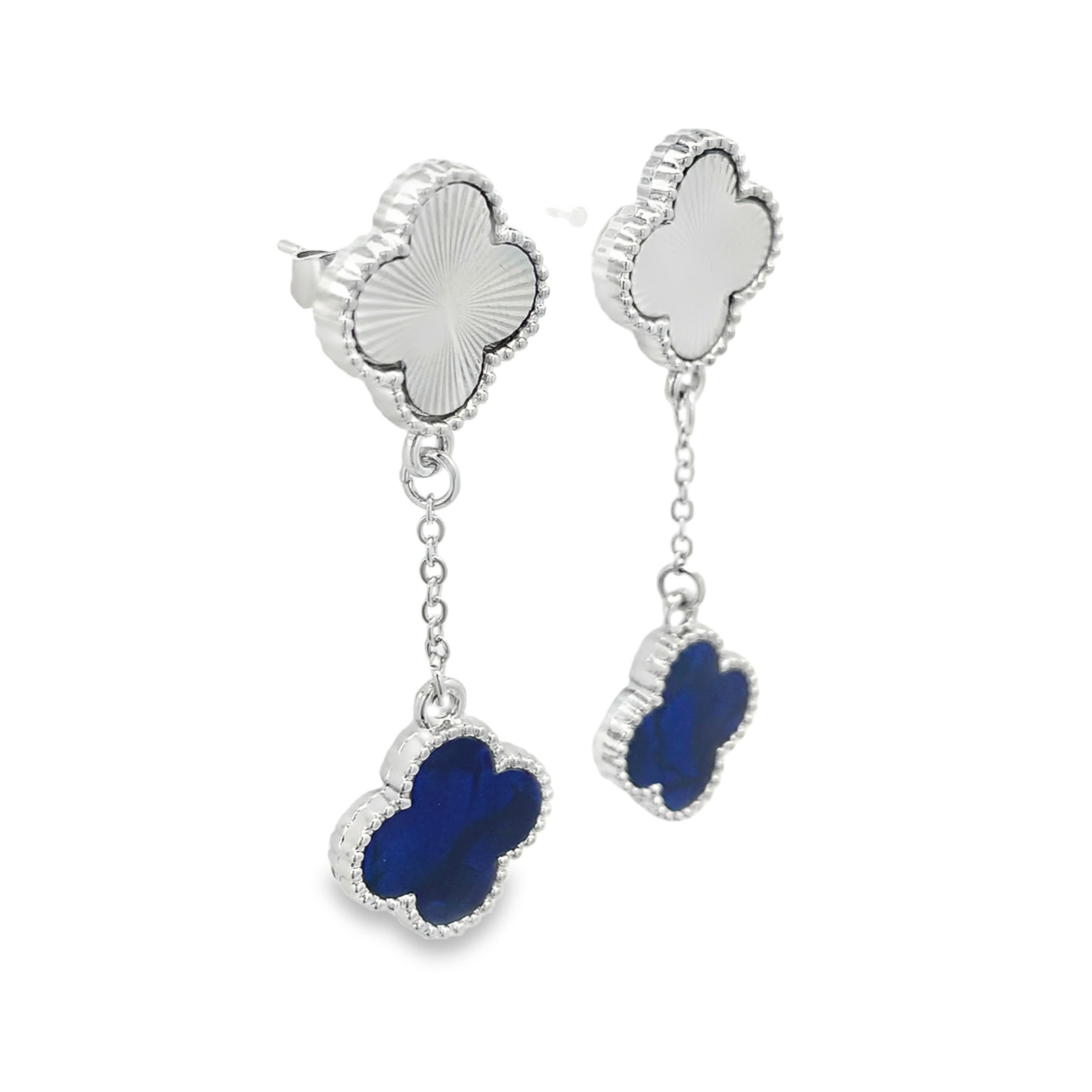 Posrebrzane wiszące kolczyki koniczyna z giloszem i niebieskim kamieniem