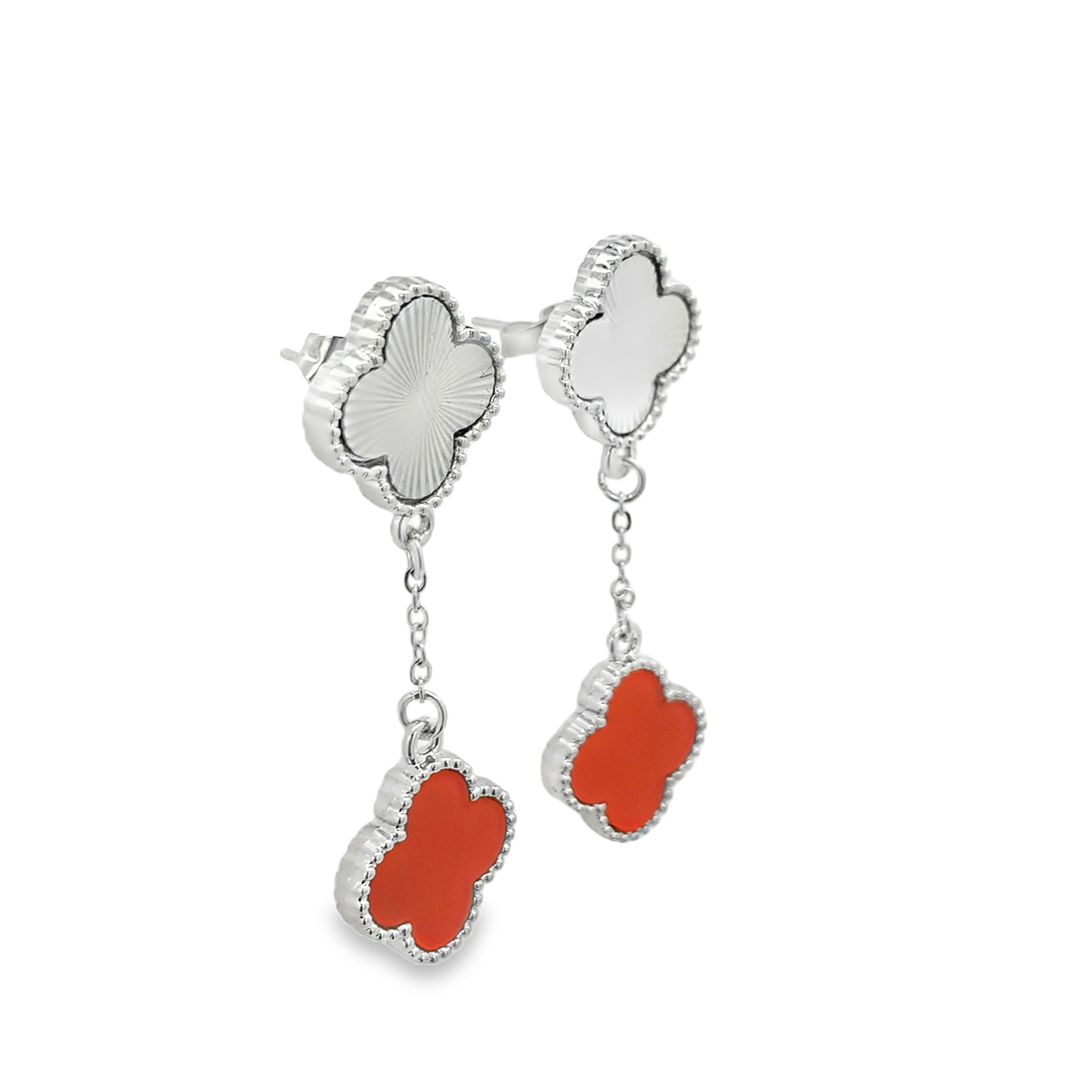 Guilloché and Reddish-Orange Agate Clover Dangle Earrings in White Gold