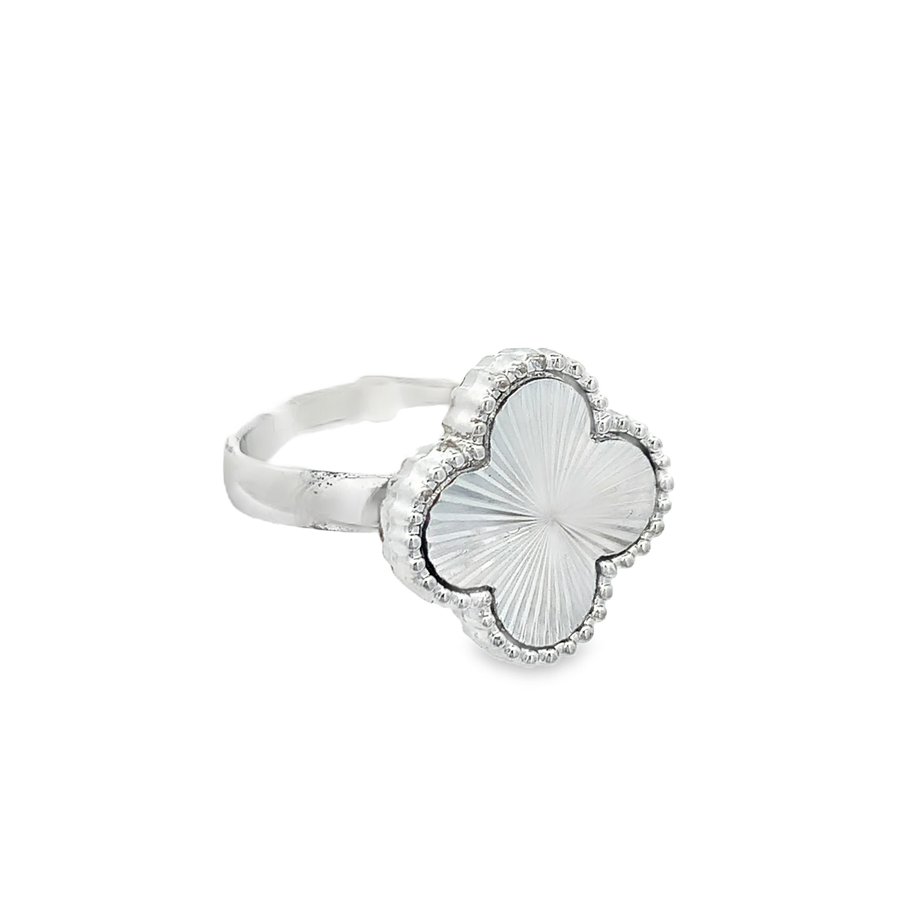 Guilloch Clover Motif Silver Ring with Beaded Milgrain Border