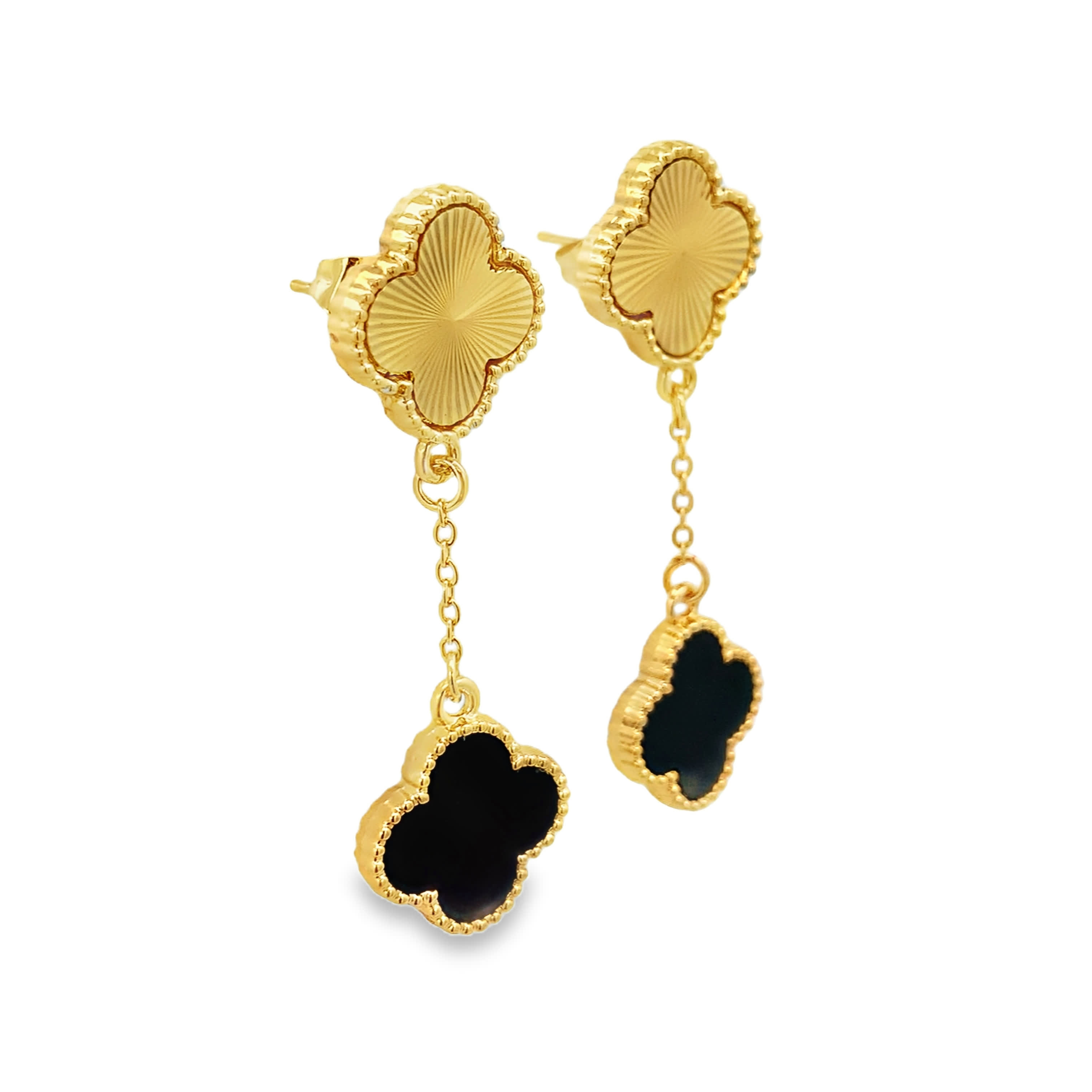 Guilloché Gold and Black Onyx Clover Drop Earrings