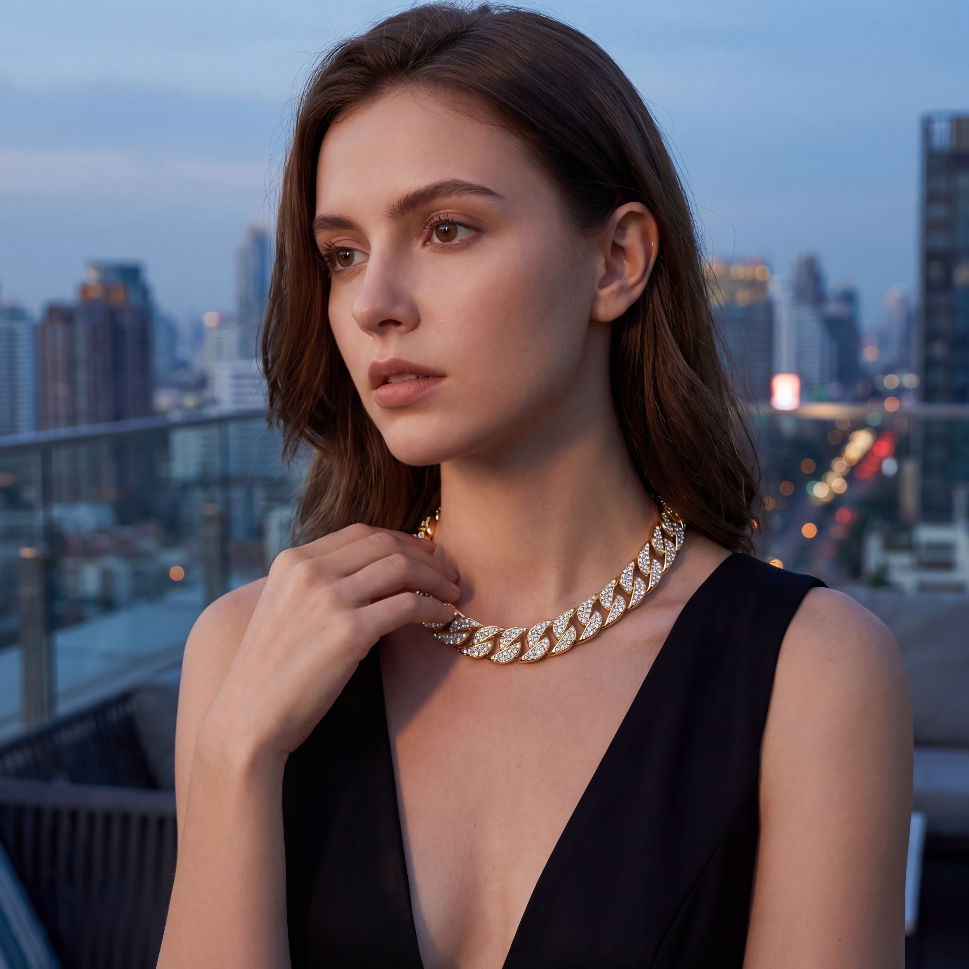 Yellow Gold Pave Crystal Set Cuban Link Statement Necklace
