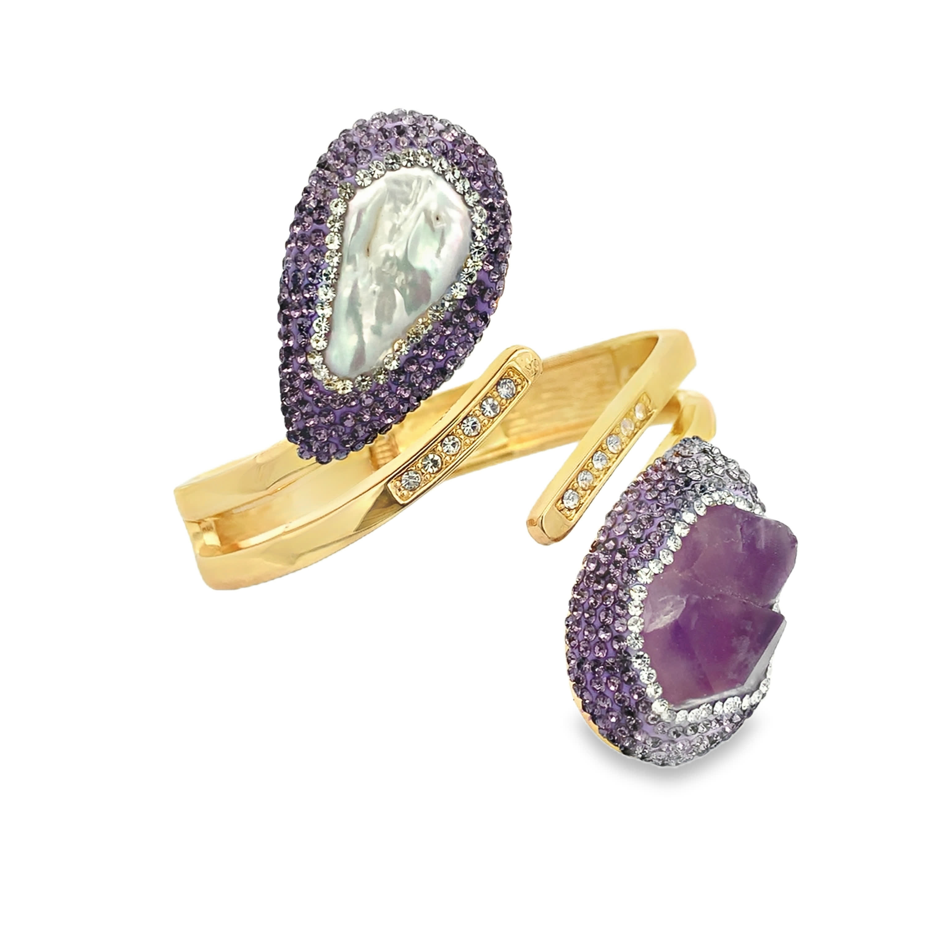 Sztywna bransoletka z pozłacanego metalu z owalnym fioletowym kamieniem ozdobnym