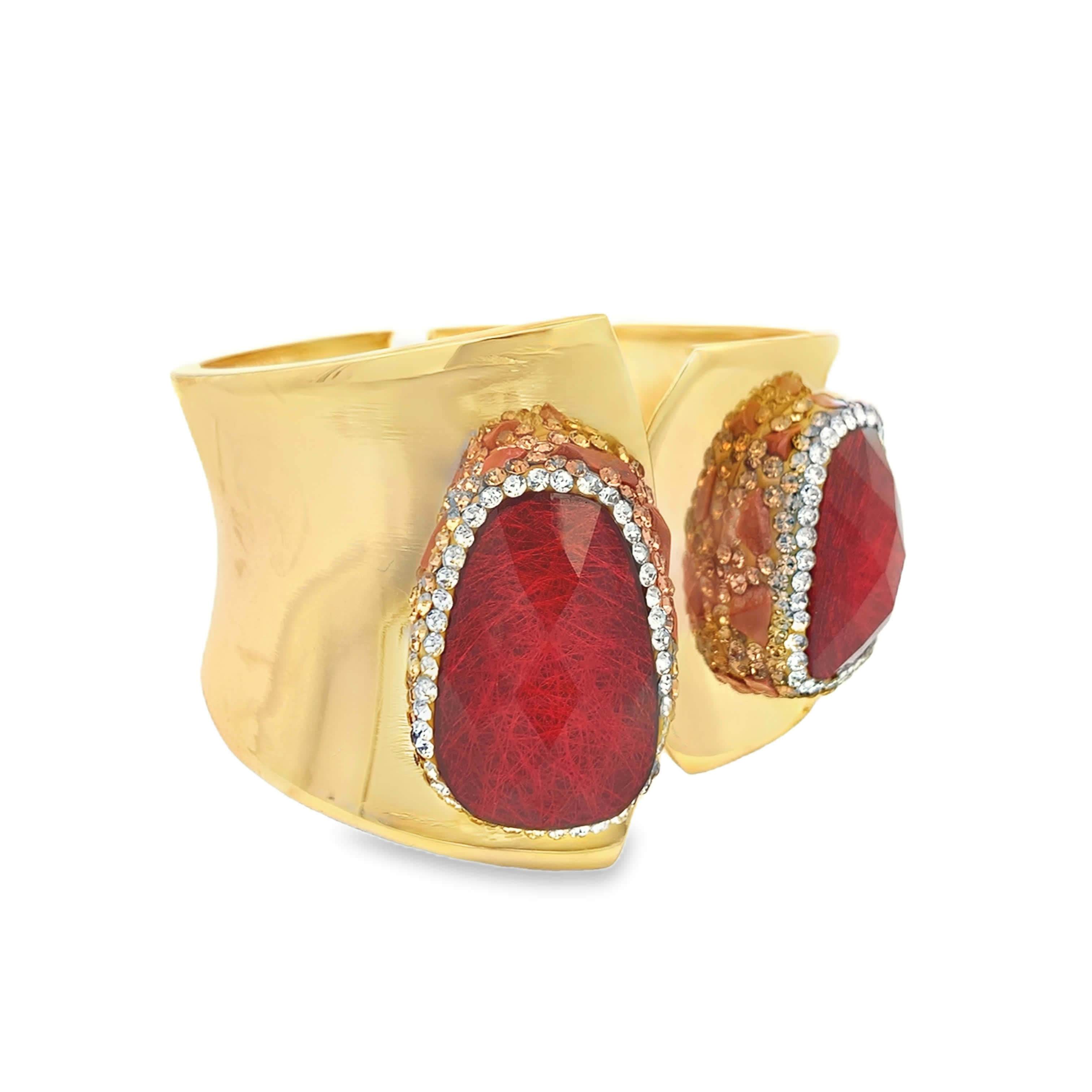 Wyrazista sztywna bransoletka z pozłacanego metalu z licznymi czerwonymi kamieniami ozdobnymi