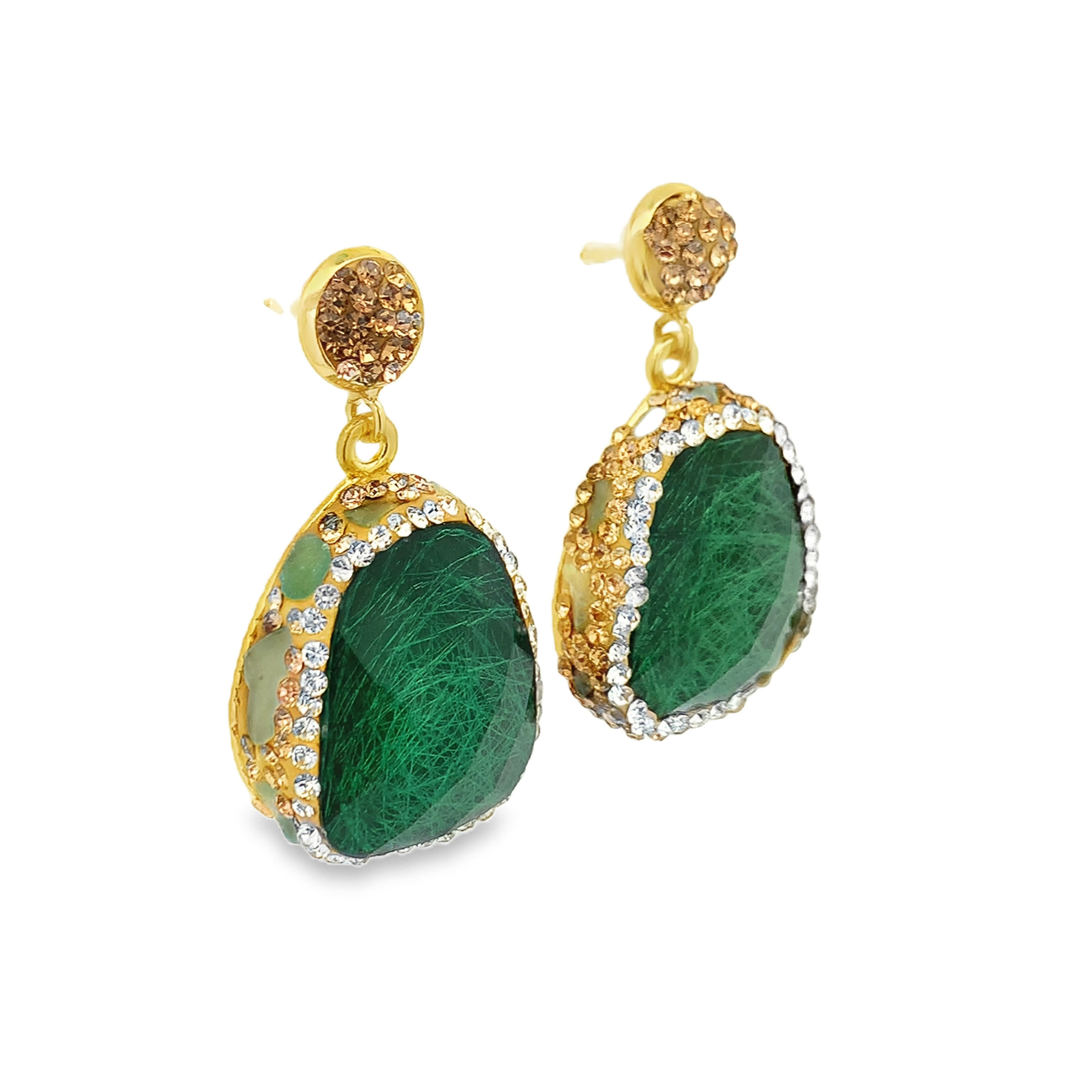 Kolczyki wiszące z pozłacanego metalu z zielonymi kamieniami ozdobnymi