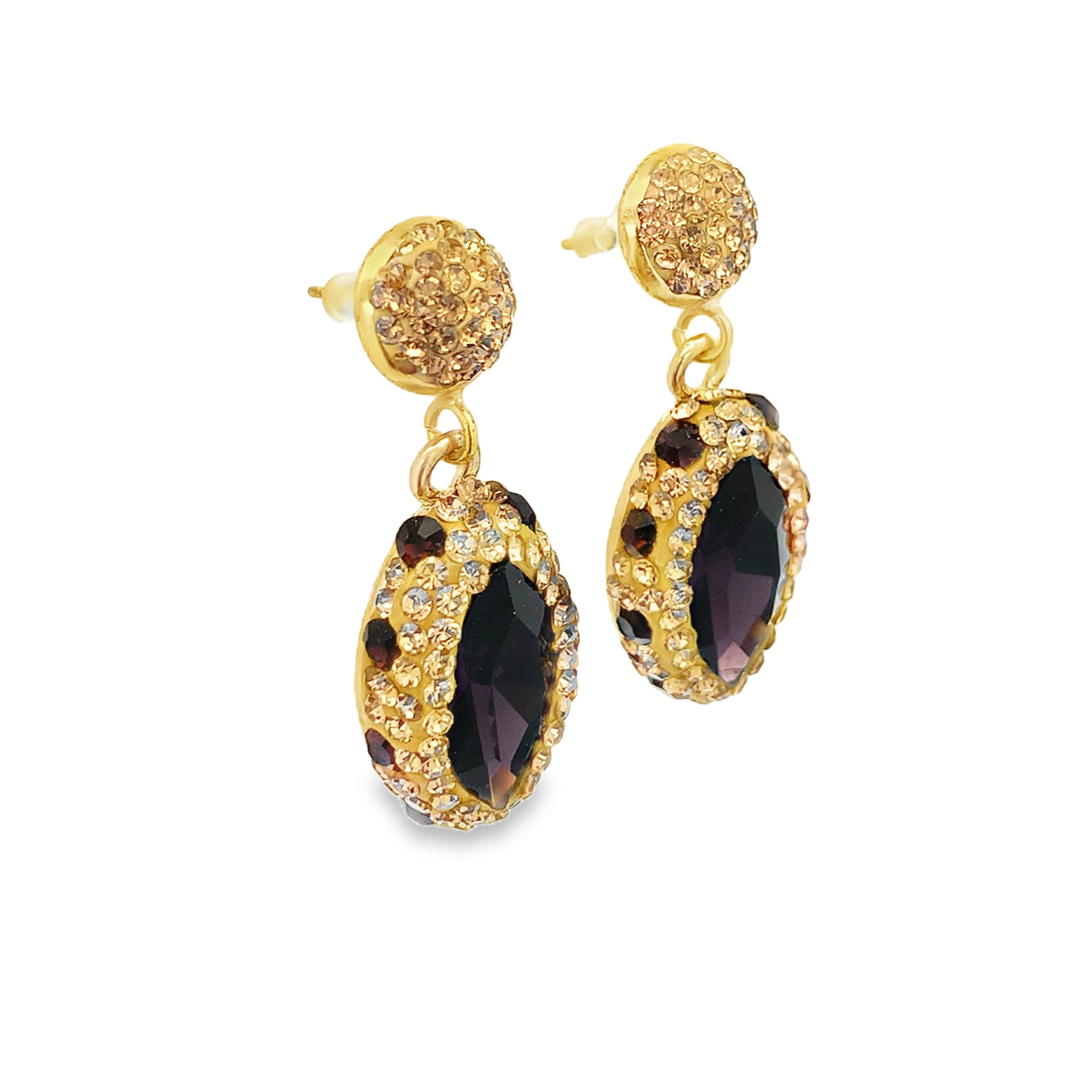 Kolczyki wiszące z pozłacanego metalu z fioletowymi kamieniami ozdobnymi