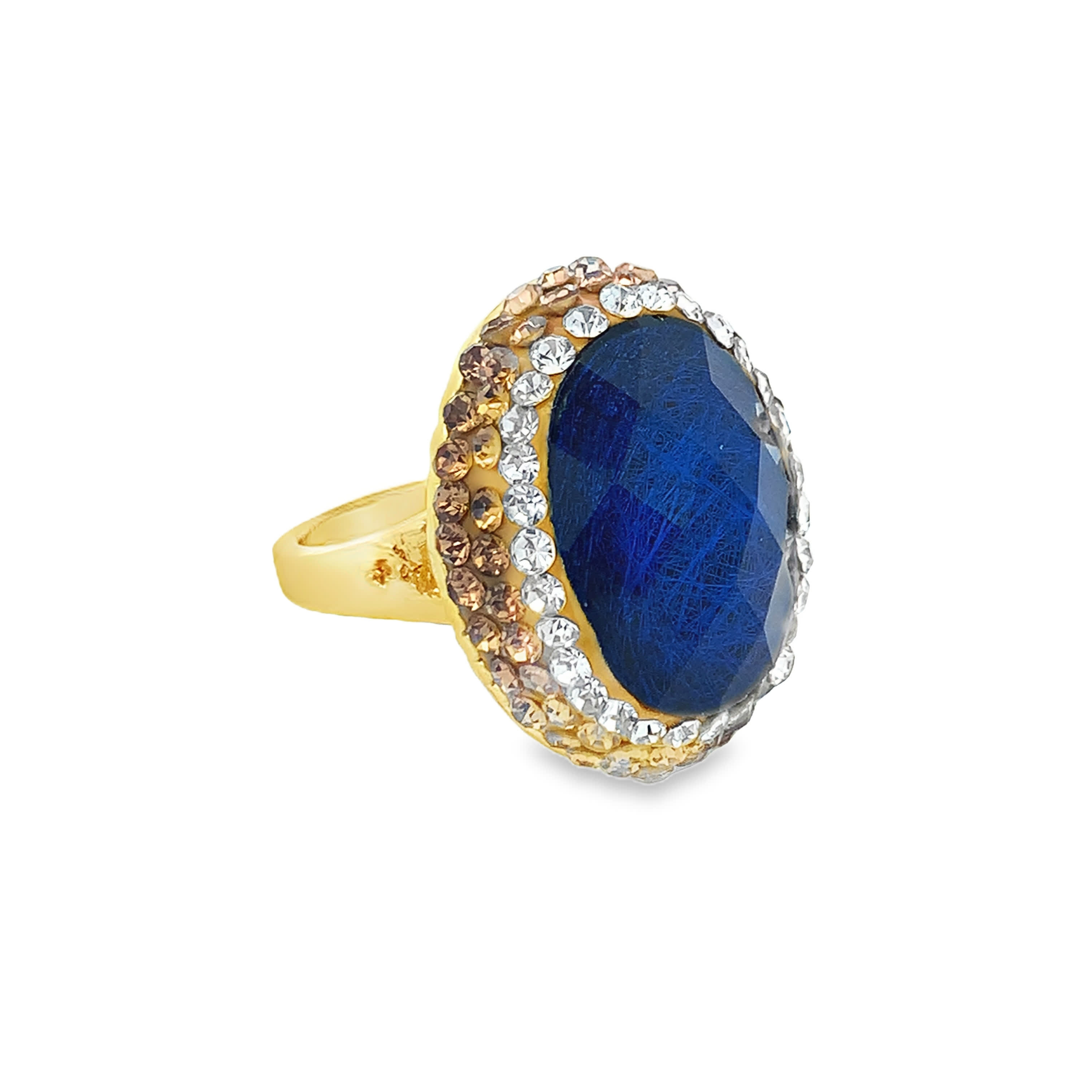 Pierścionek koktajlowy z pozłacanego metalu z niebieskim kamieniem ozdobnym
