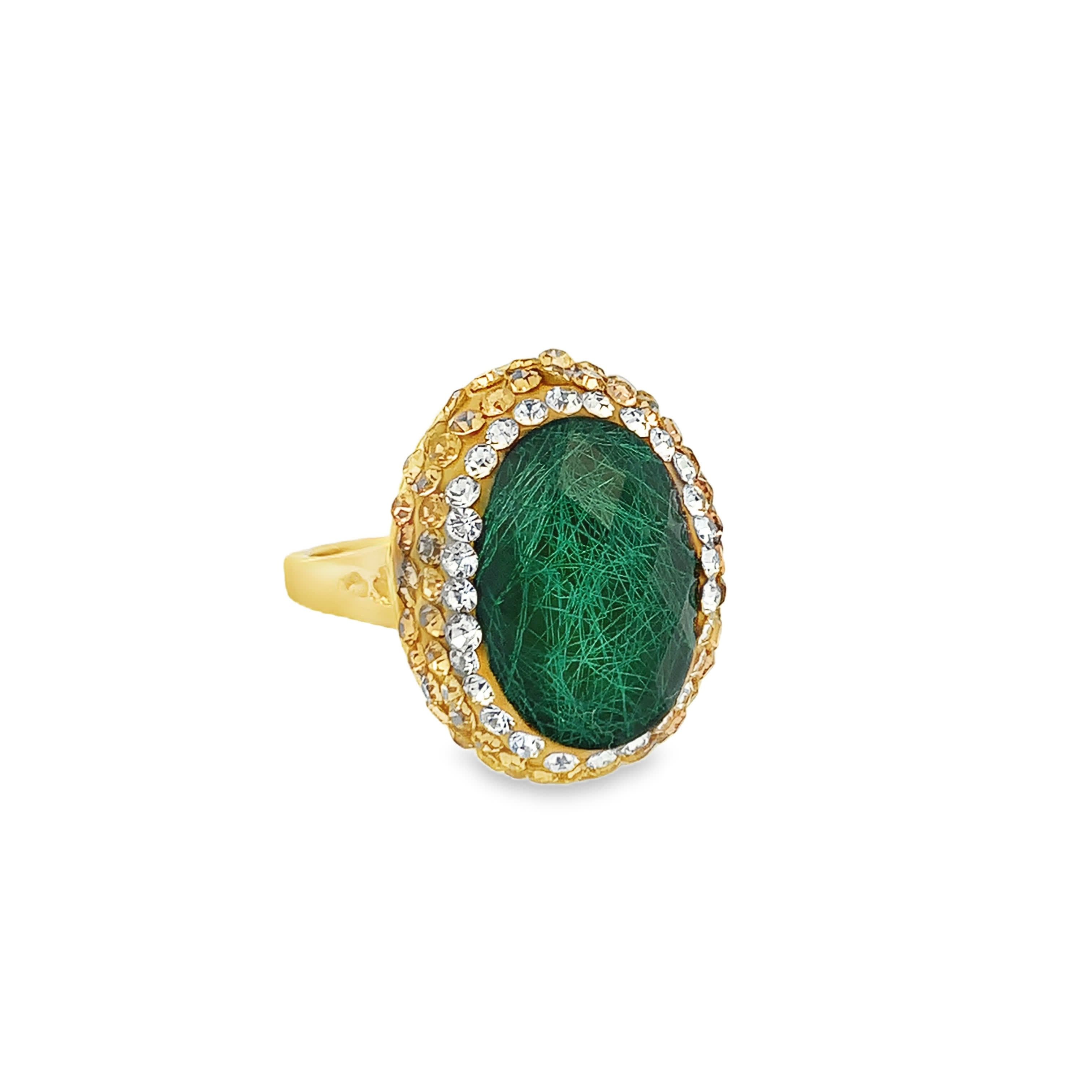 Pierścionek koktajlowy z pozłacanego metalu z zielonym kamieniem ozdobnym