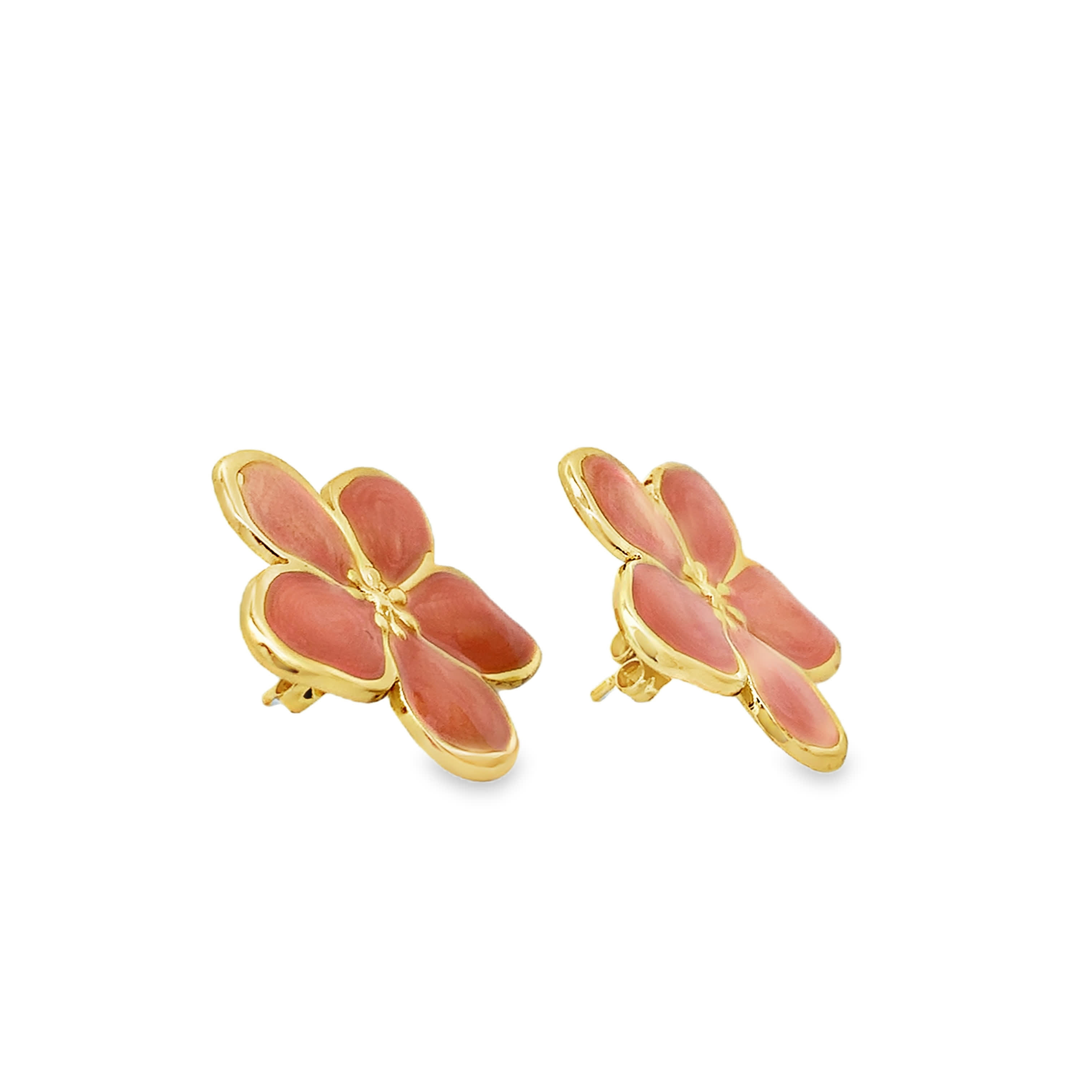 Natural Reddish Orange Carved Coral Star Stud Earrings in Yellow Gold