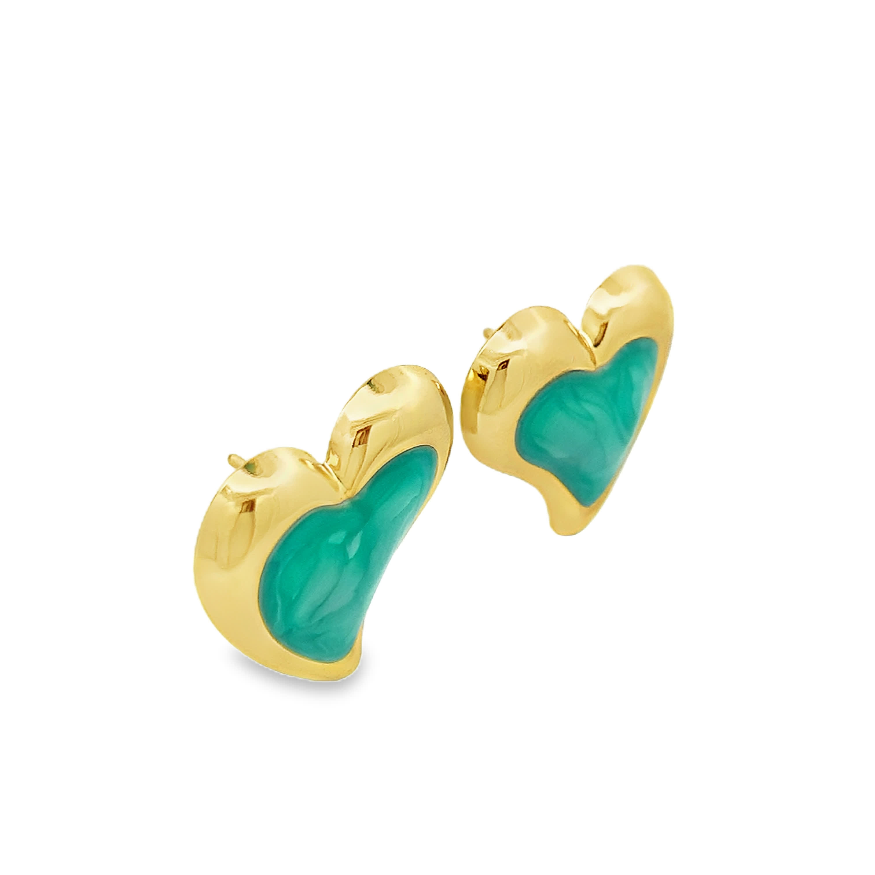 Heart Shaped Green Jade Cabochon Stud Earrings in Yellow Gold