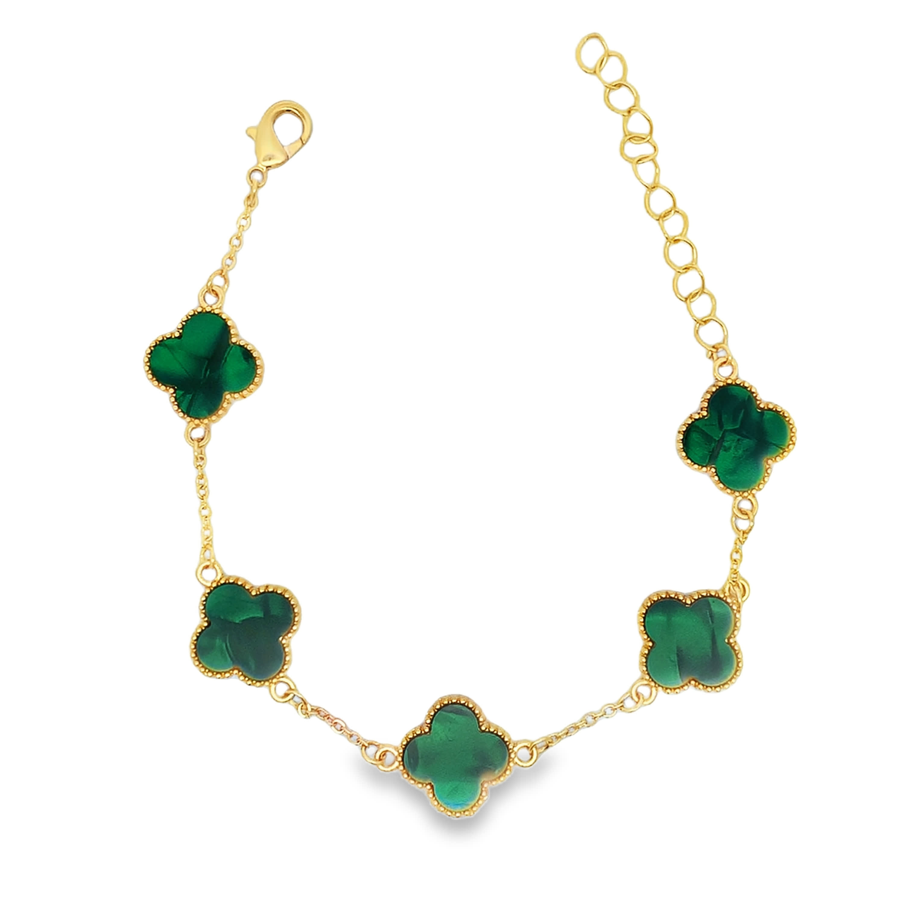 Vintage Style Yellow Gold Malachite Quatrefoil Chain Bracelet
