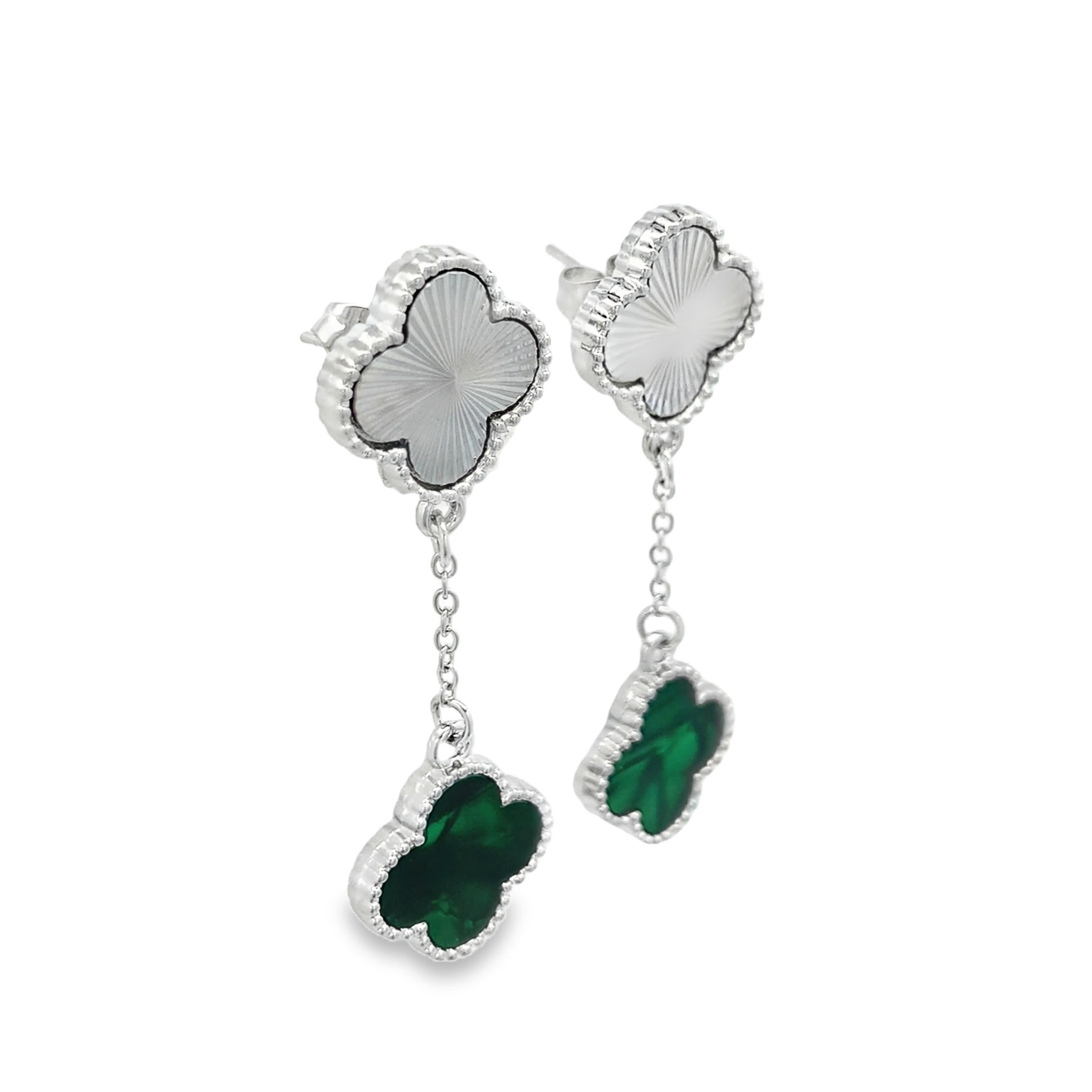 White Gold Guilloché and Green Malachite Clover Drop Earrings
