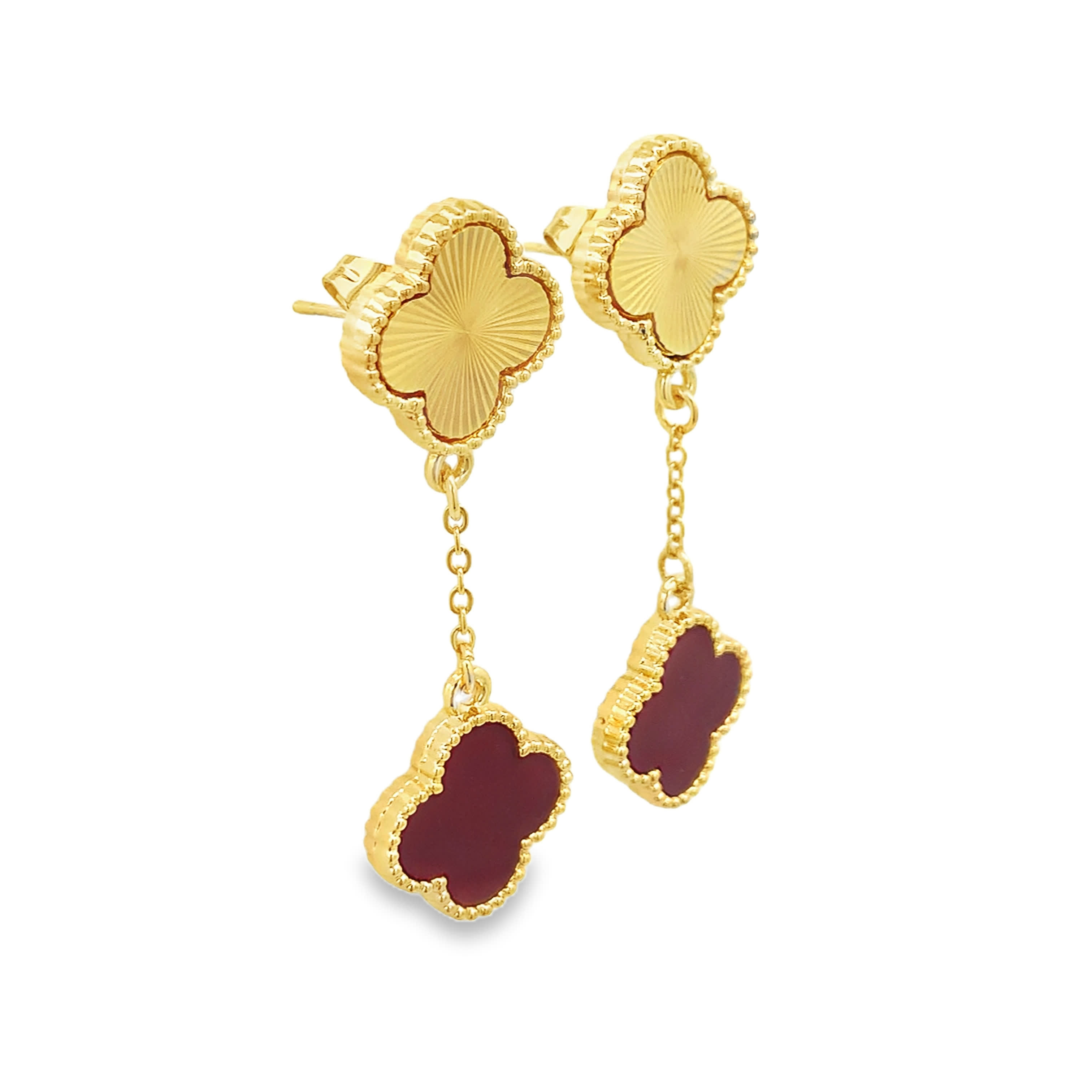 Guilloche Gold and Red Agate Clover Drop Earrings