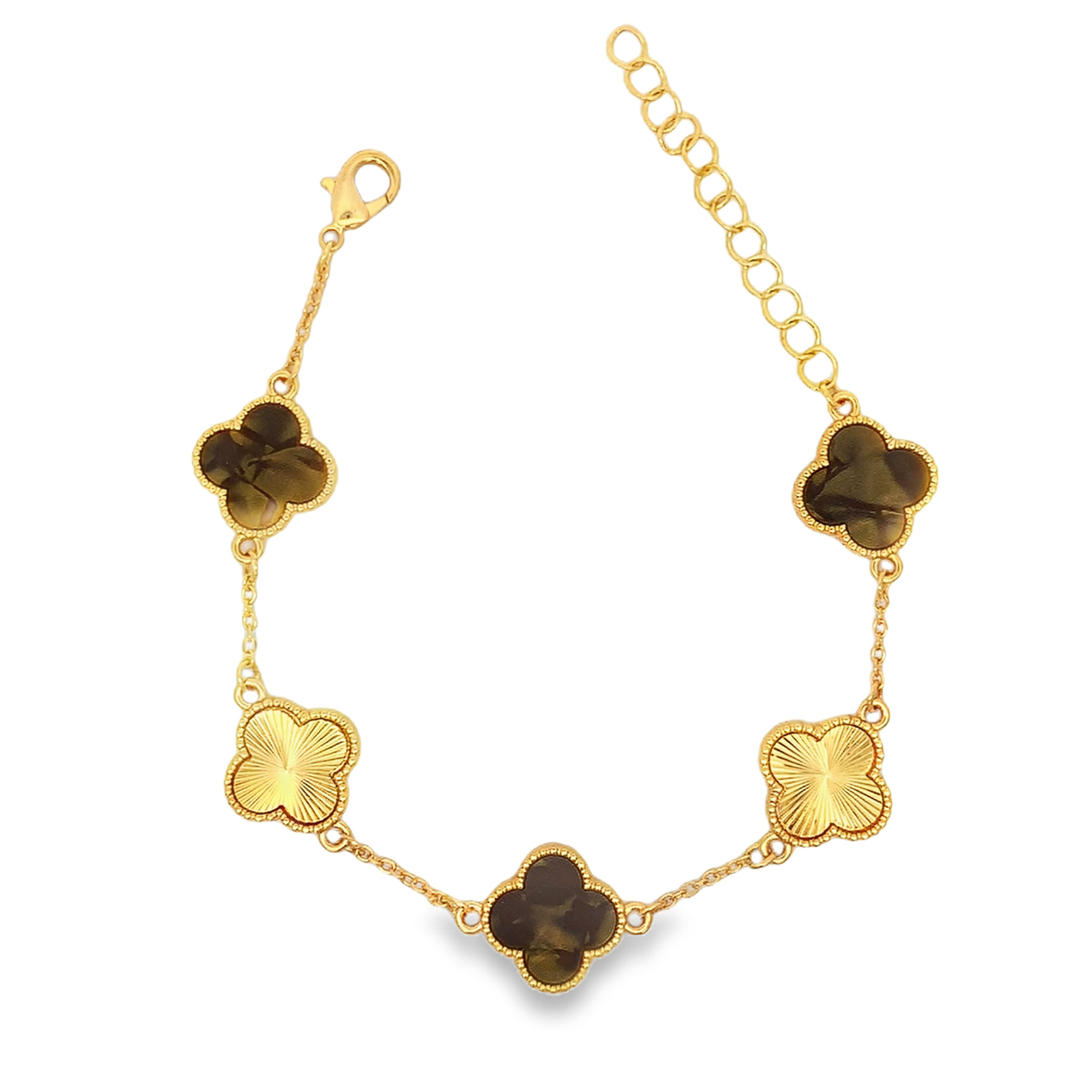 Yellow Gold Guilloch and Grey Onyx Five-Motif Clover Bracelet
