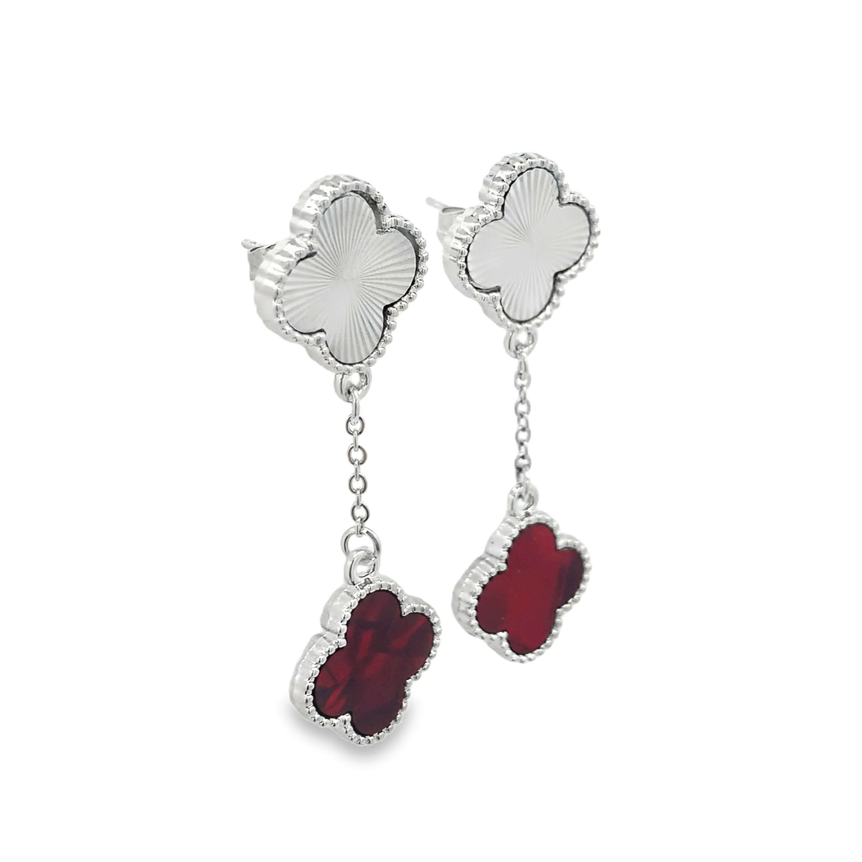 Posrebrzane wiszące kolczyki czterolistne sunburst z czerwonym kamieniem