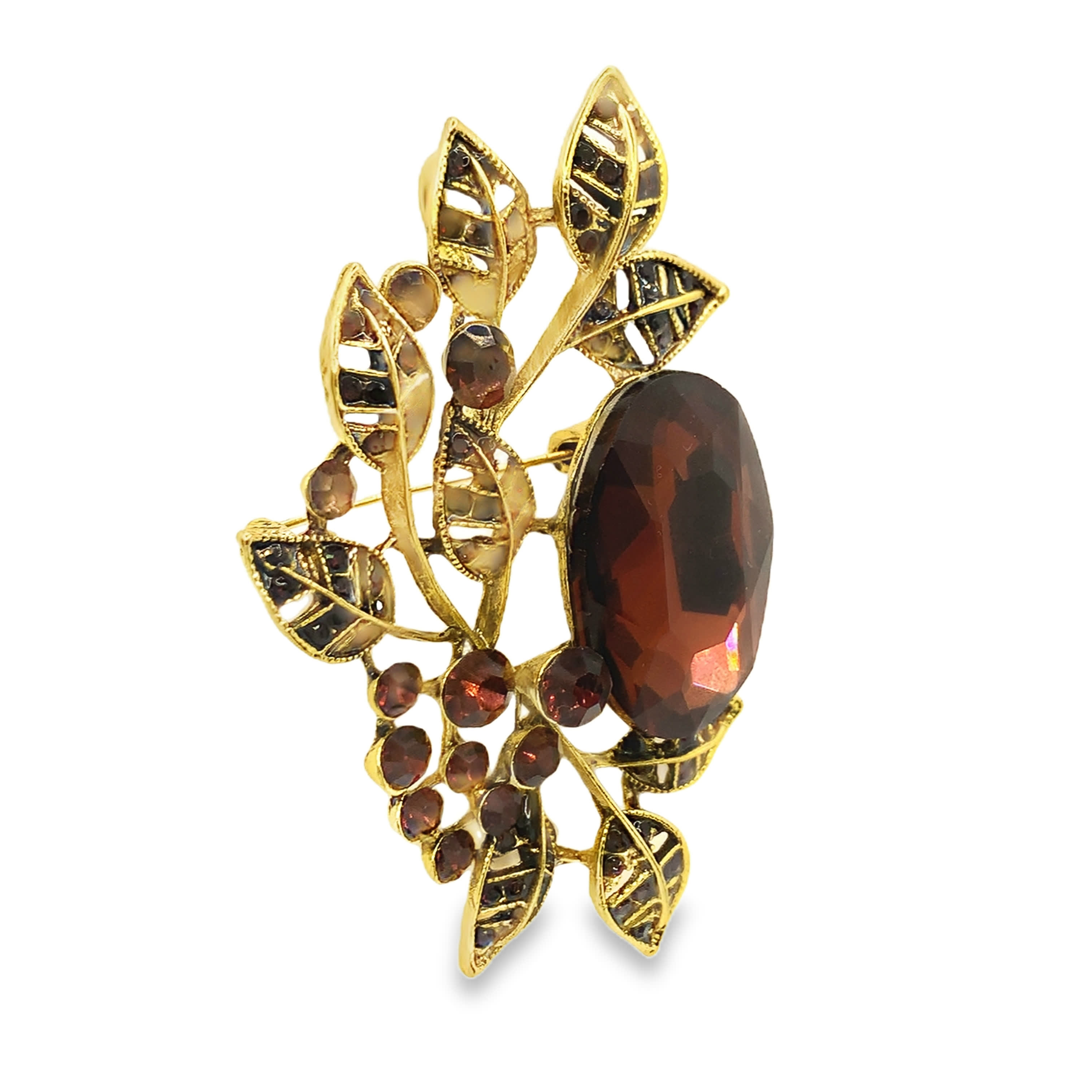 Pozłacana broszka liść w stylu antycznym z owalnymi i okrągłymi kamieniami