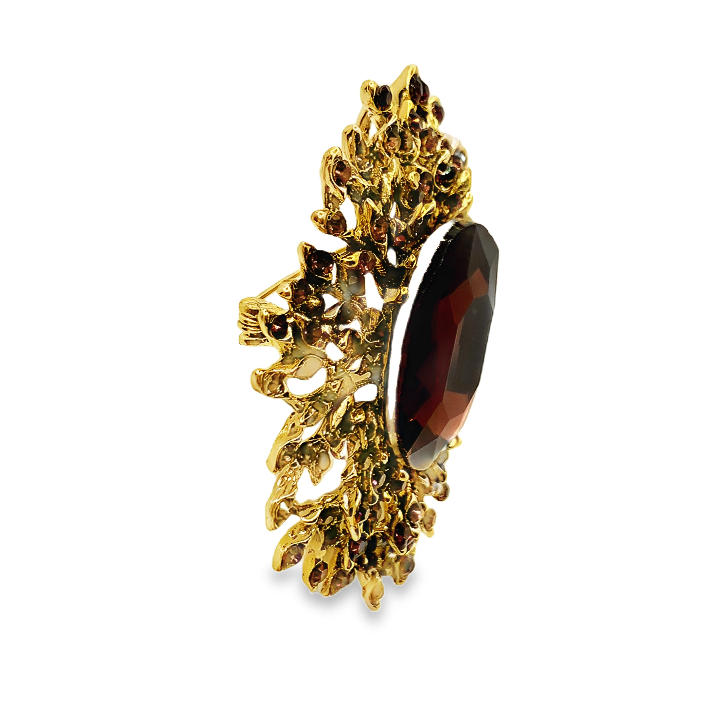 Pozłacana broszka kwiatowy klaster owalna w stylu vintage z czerwonofioletowymi kamieniami