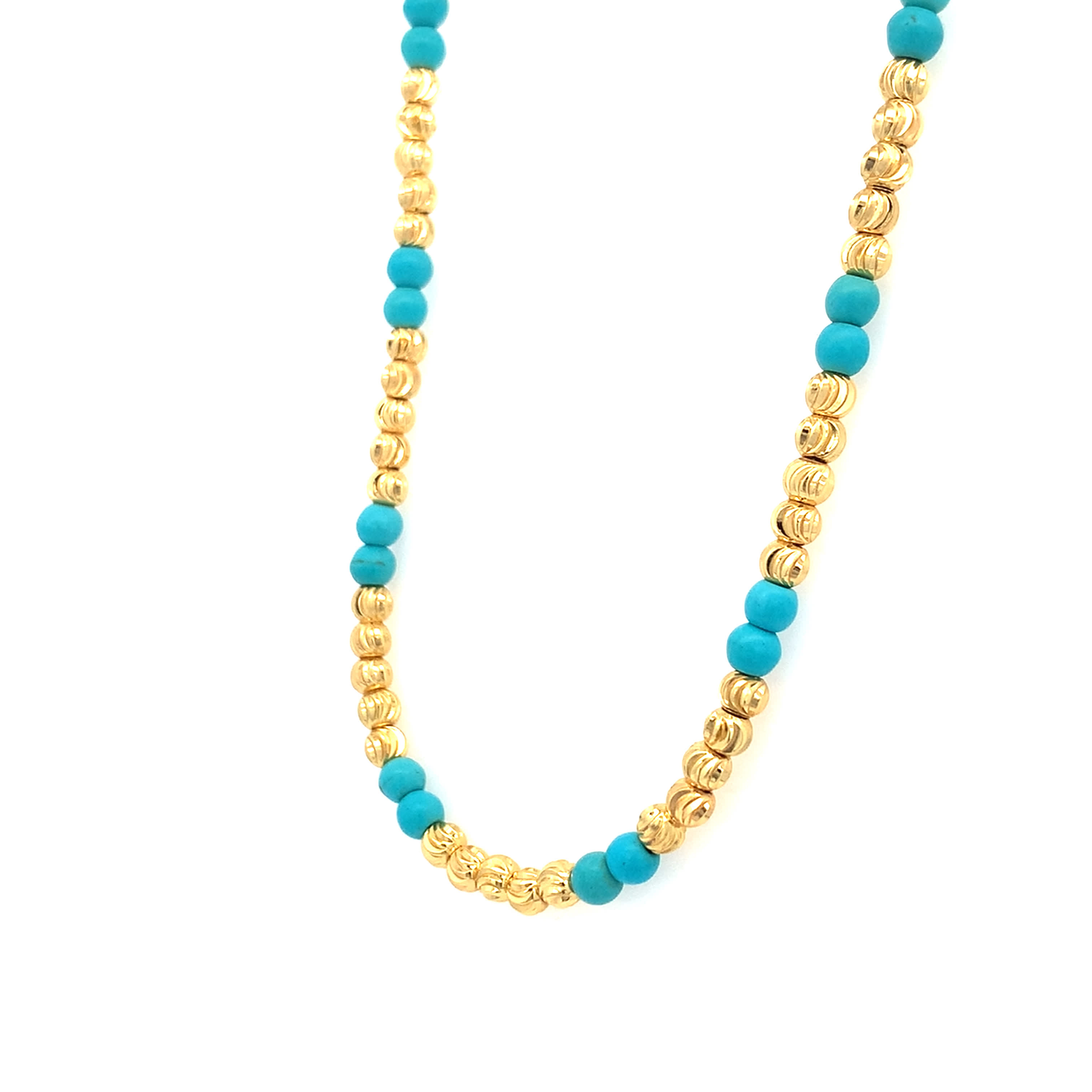 Ten oszałamiający naszyjnik charakteryzuje się harmonijnym połączeniem złoconych i turkusowych koralików, tworząc żywy i przyciągający wzrok dodatek. Idealny zarówno na okazje codzienne, jak i formalne, dodaje odrobinę elegancji do każdego stroju. Skomplikowany projekt prezentuje kunszt, który podkreśla piękno każdego koralika.