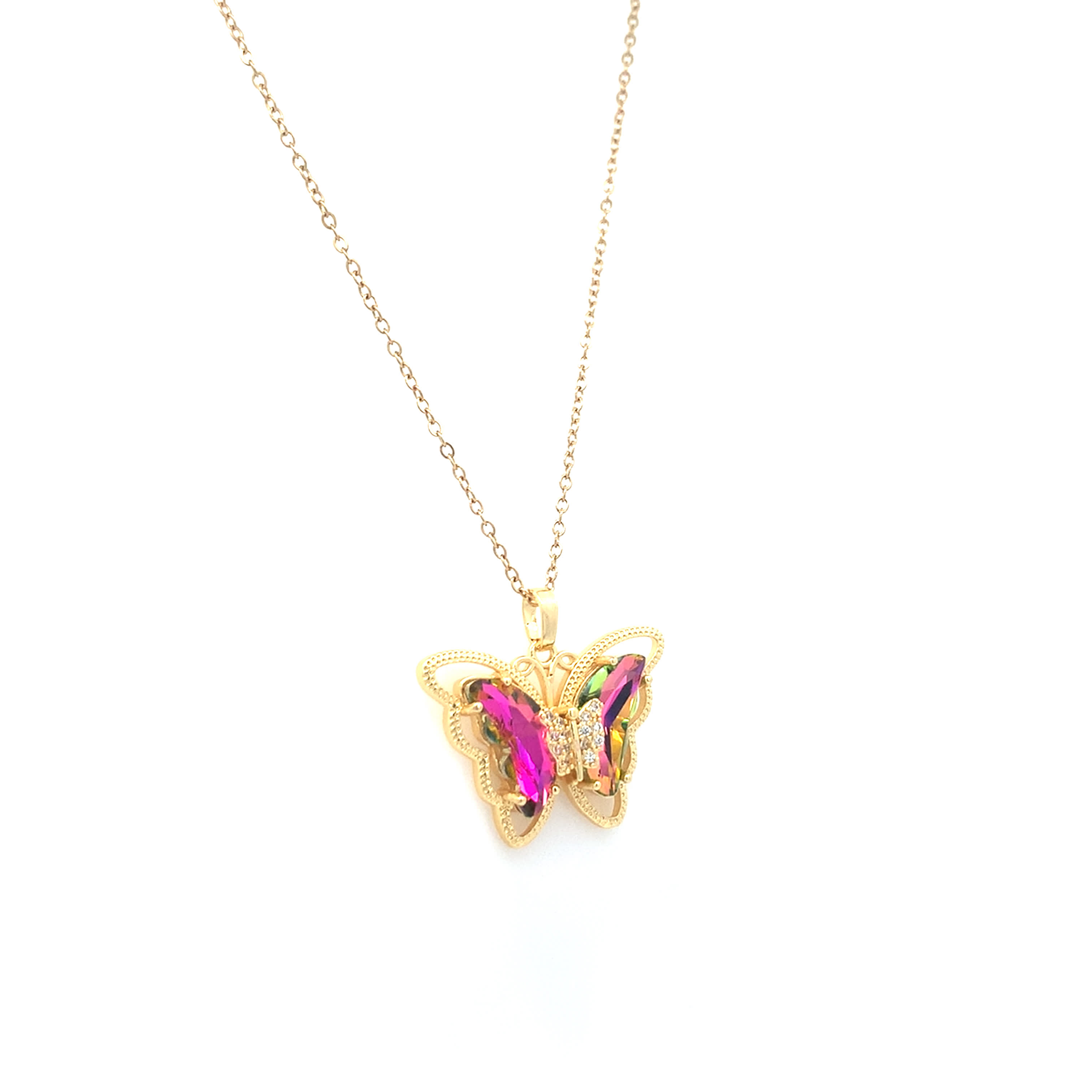 Ten oszałamiający naszyjnik z wisiorkiem motyla charakteryzuje się misternymi złocistymi detalami i żywymi różowymi kamieniami , dzięki czemu jest idealnym dodatkiem na każdą okazję. Jego delikatny design dodaje odrobinę elegancji i fantazji, idealny zarówno do swobodnych, jak i formalnych strojów.