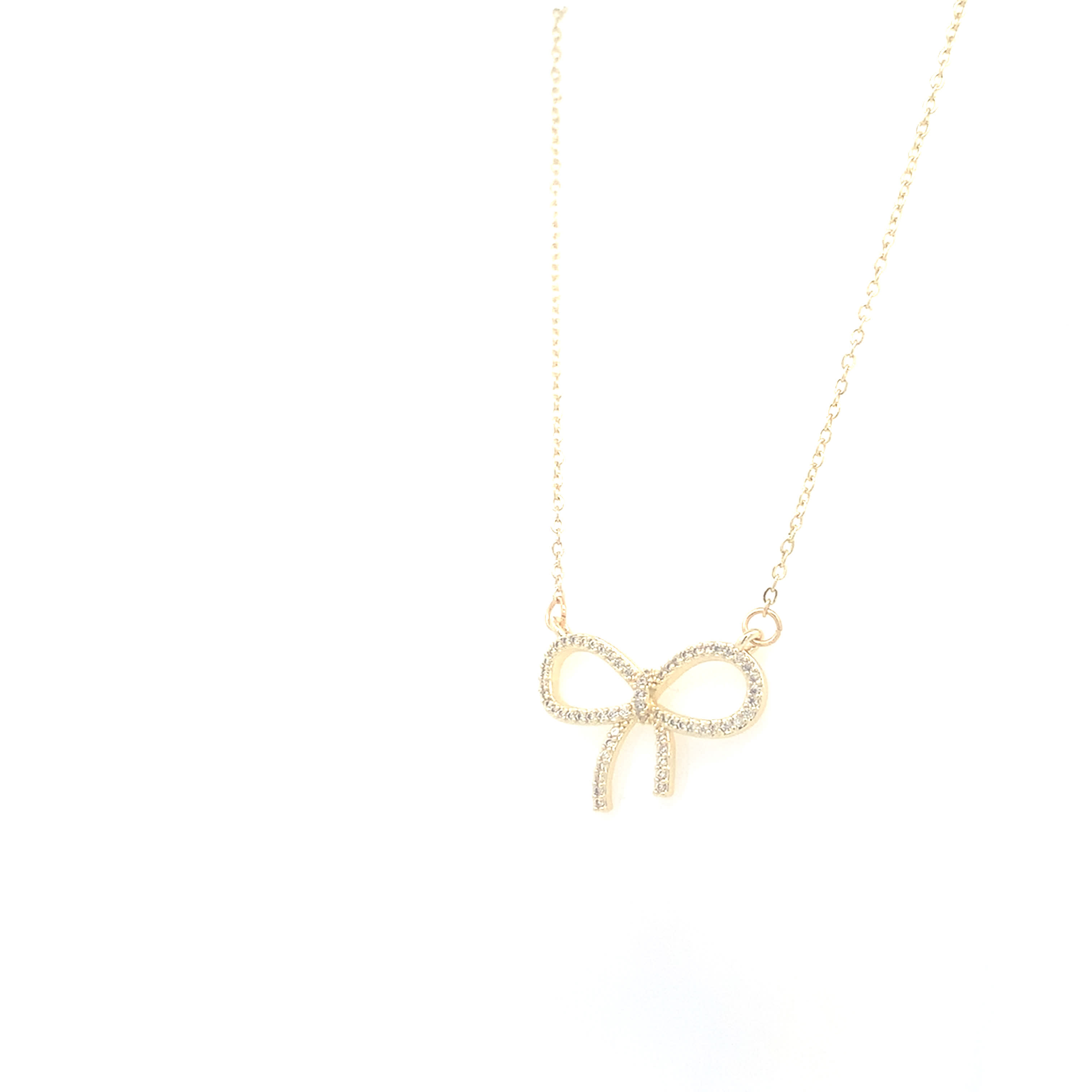 Ten oszałamiający złocony wisiorek ma delikatny wzór kokardki, ozdobiony błyszczącymi akcentami, które pięknie odbijają światło. Idealny do dodania odrobiny elegancji do każdego stroju, ten naszyjnik jest wszechstronnym dodatkiem zarówno na okazje codzienne, jak i formalne.