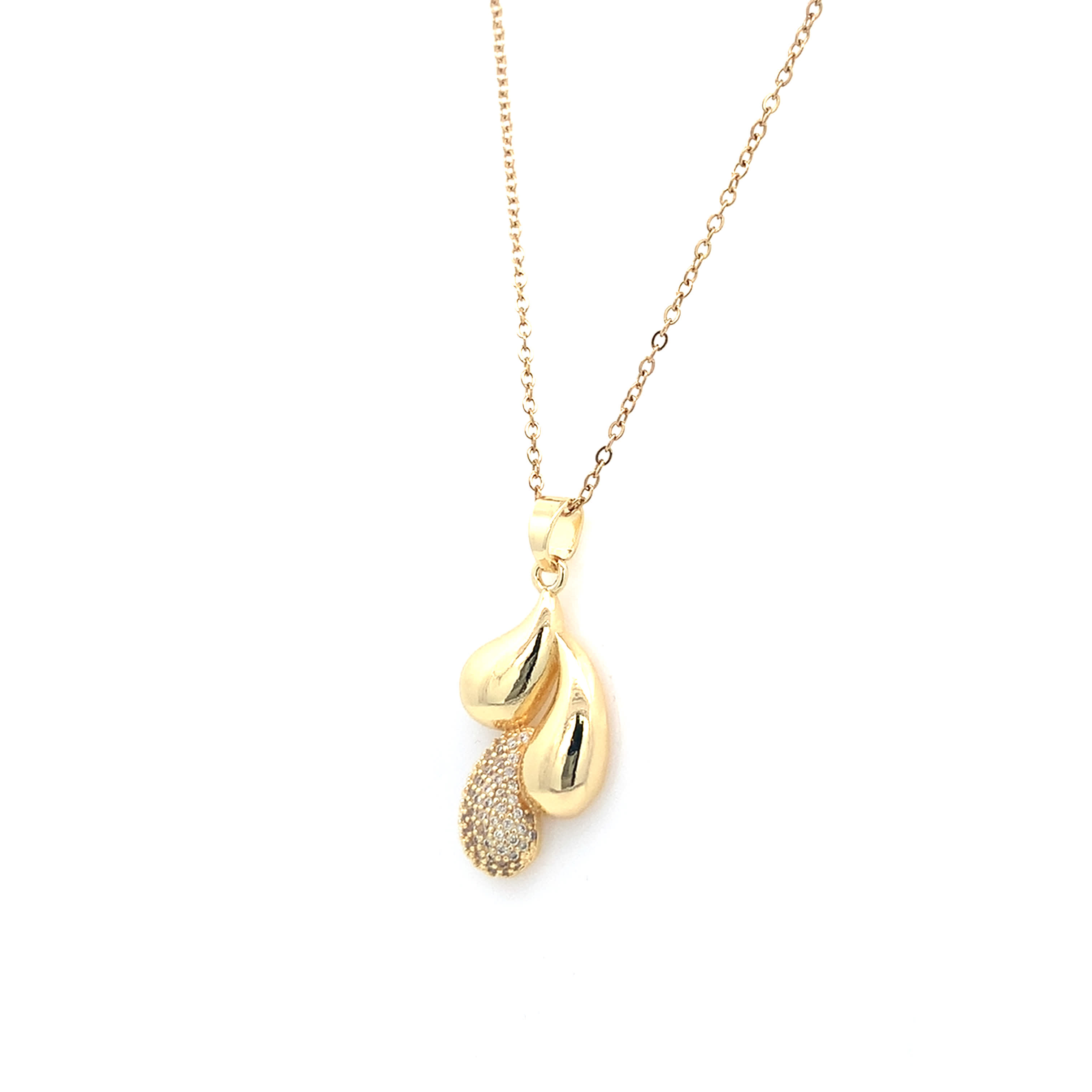 Ten oszałamiający złocony naszyjnik z wisiorkiem wyróżnia się wyjątkowym wzorem z trzema eleganckimi kroplami, idealnymi do dodania odrobiny wyrafinowania do każdego stroju. Lśniące złocone wykończenie pięknie odbija światło, dzięki czemu jest przyciągającym wzrok dodatkiem zarówno na okazje codzienne, jak i formalne.
