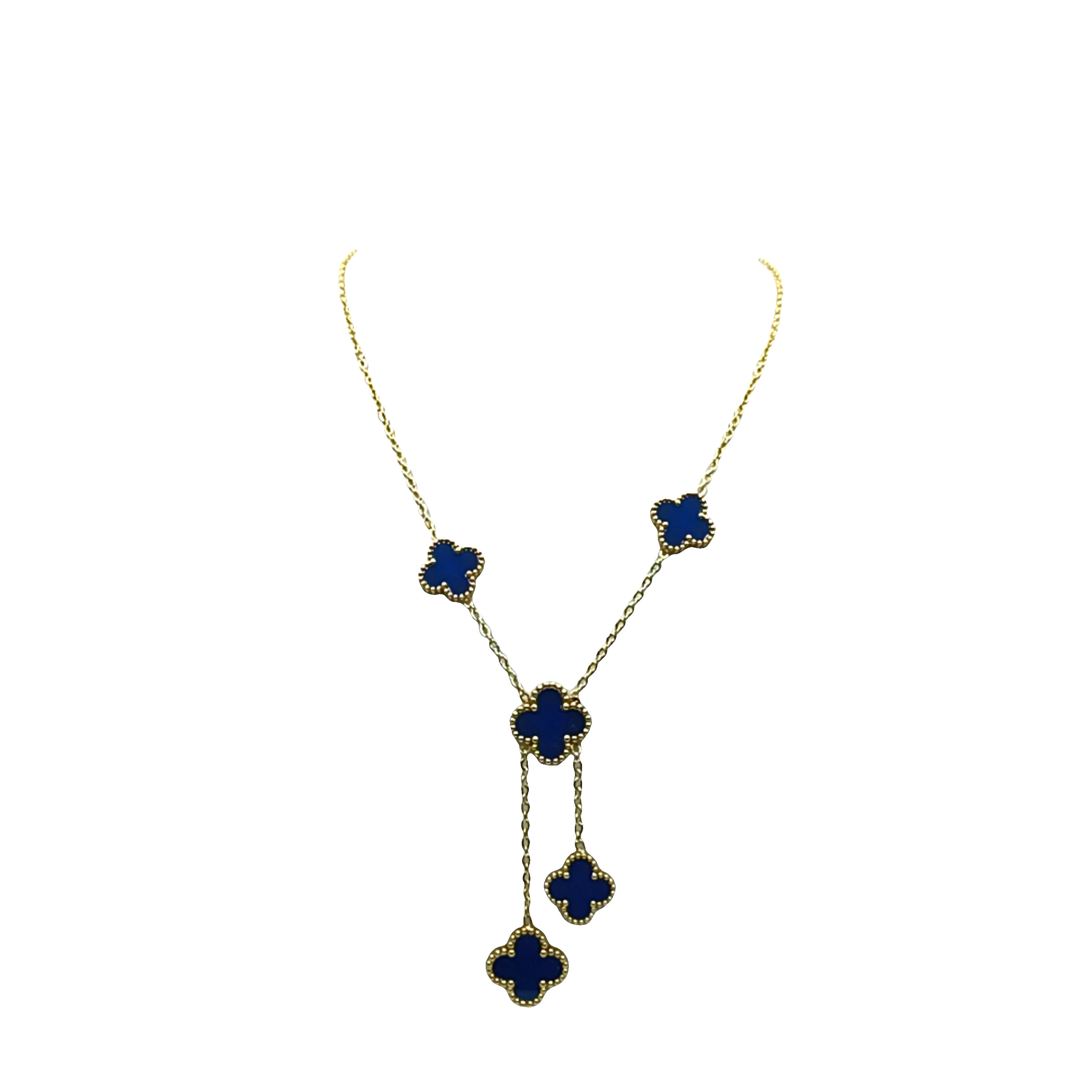 Podnieś swój styl dzięki temu czarującemu kamieniemu naszyjnikowi, prezentującemu kaboszony w motywie koniczyny. Bogate niebieskie odcienie starannie szlifowanego oferują uderzający kontrast z ciepłym złocistym otoczeniem, tworząc ponadczasowy element idealny na każdą okazję. Ten naszyjnik z zawieszkami to luksusowy dodatek do każdej kolekcji biżuterii.
