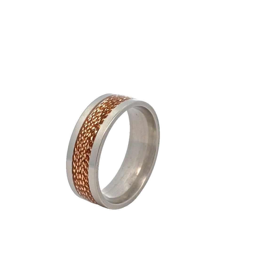 Odkryj idealne połączenie stylu i wyrafinowania dzięki tej eleganckiej dwukolorowej obrączce ślubnej. Wykonana z wysokiej jakości materiałów, charakteryzuje się oszałamiającym posrebrzanym wykończeniem uzupełnionym o wyjątkową tkaną miedzianą intarsję. Ten pierścionek to nie tylko biżuteria; to symbol miłości i zaangażowania, który przetrwa całe życie.