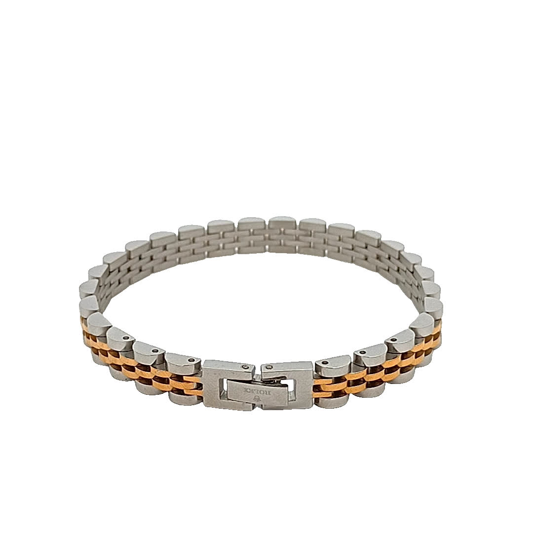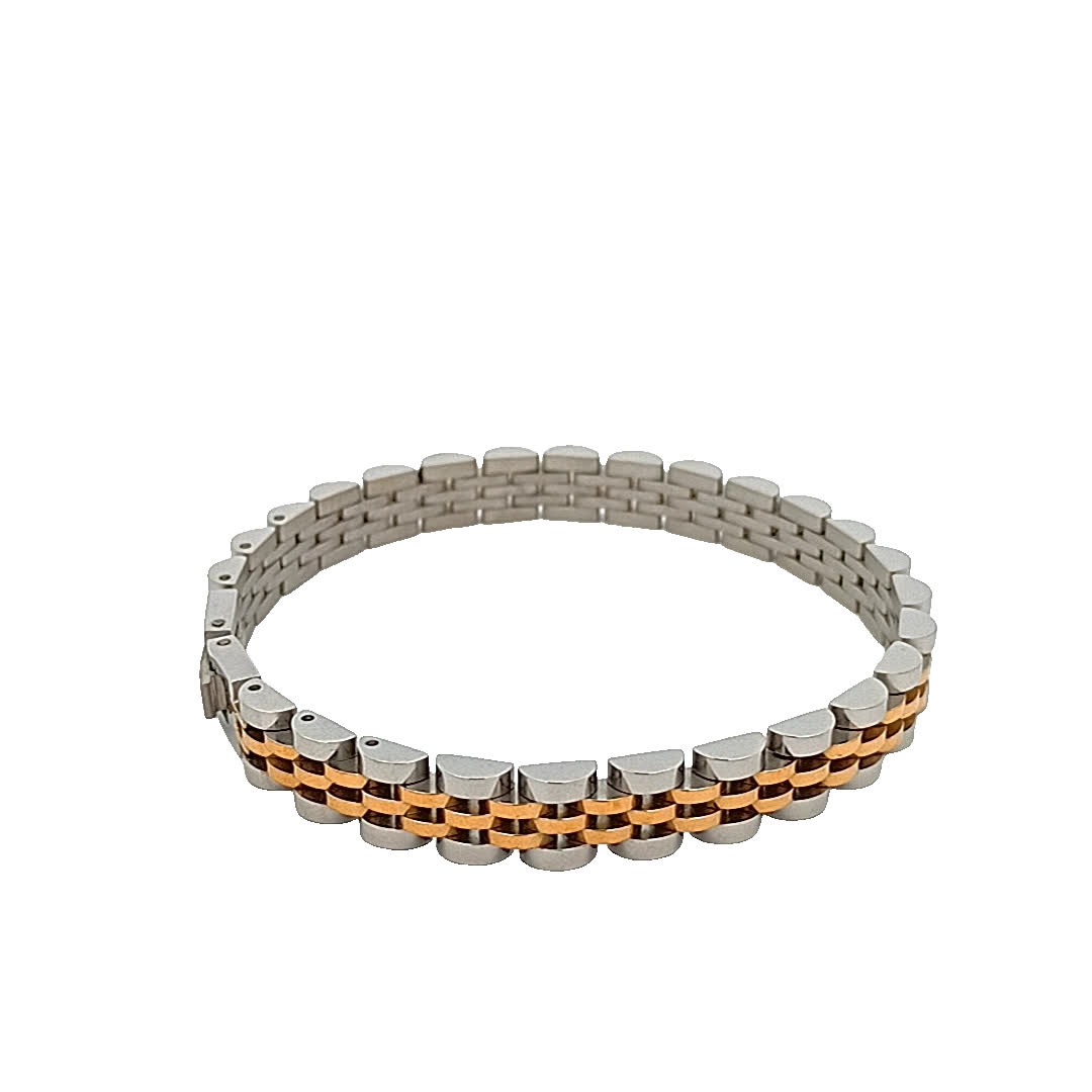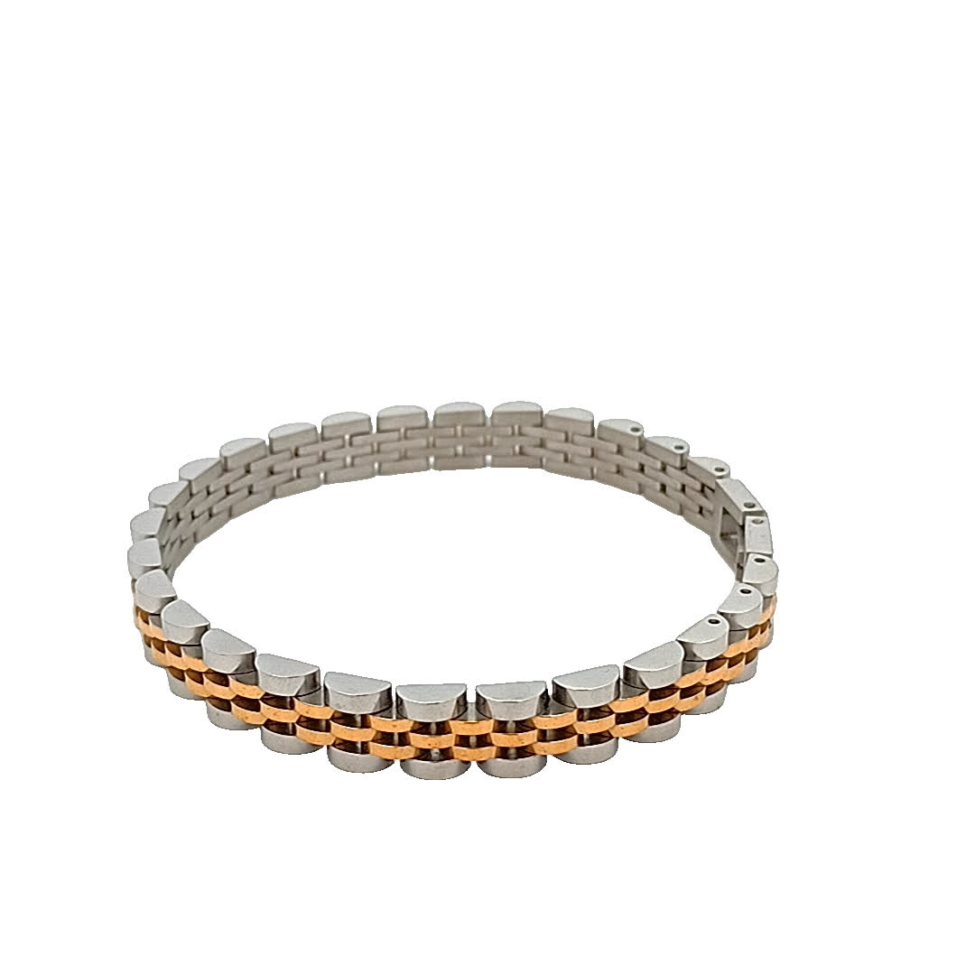 Ta oszałamiająca dwukolorowa bransoletka łączy w sobie eleganckie posrebrzane i ciepłe złocone akcenty, tworząc idealną równowagę elegancji i nowoczesności. Jej wyjątkowy design charakteryzuje się naprzemiennymi metalowymi elementami, które pięknie odbijają światło, dzięki czemu jest idealnym dodatkiem zarówno na okazje codzienne, jak i formalne.