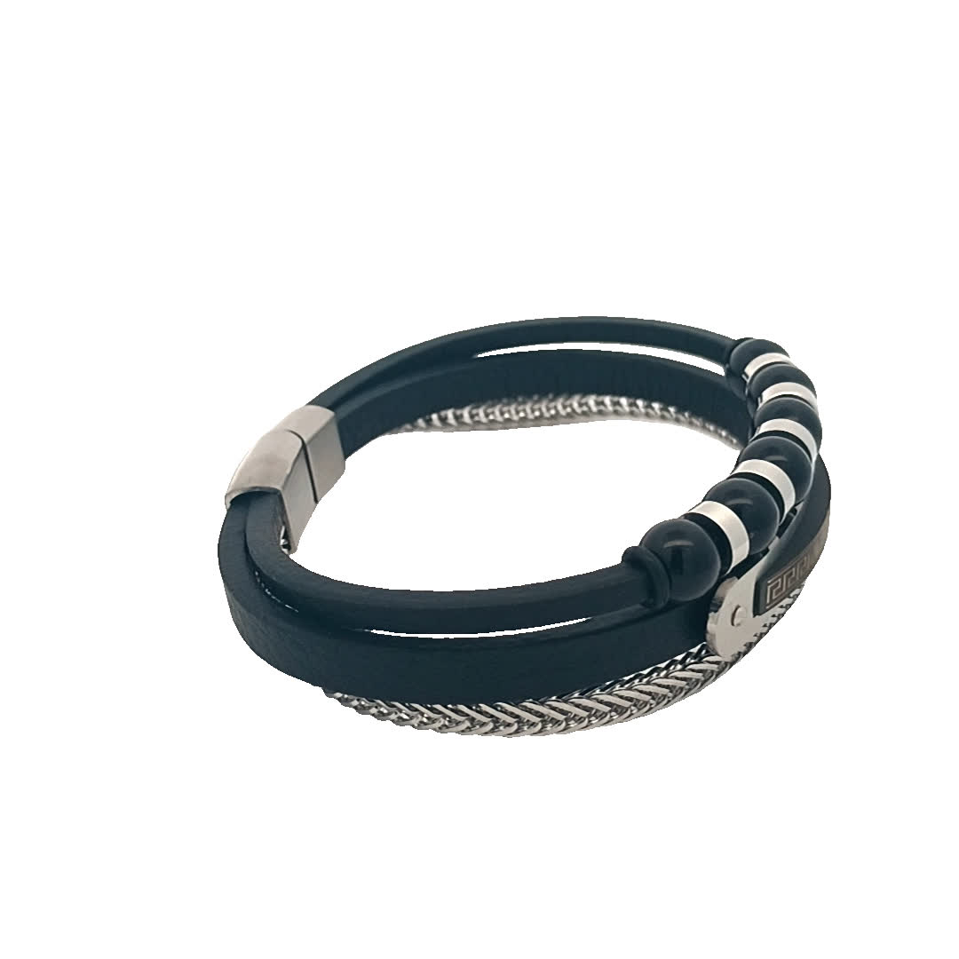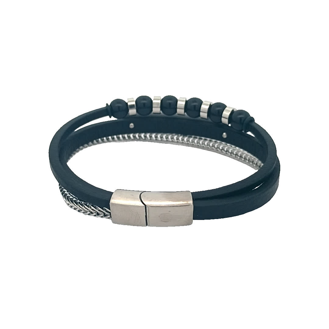 Podnieś poziom swoich dodatków dzięki tej stylowej czarnej skórzanej bransoletce. Dzięki wyjątkowemu wzornictwu z plecionymi elementami i eleganckimi metalowymi akcentami idealnie nadaje się zarówno na okazje codzienne, jak i formalne. Połączenie czarnych koralików i polerowanej srebrnej płytki dodaje odrobinę wyrafinowania, dzięki czemu jest to niezbędny element każdej kolekcji biżuterii.