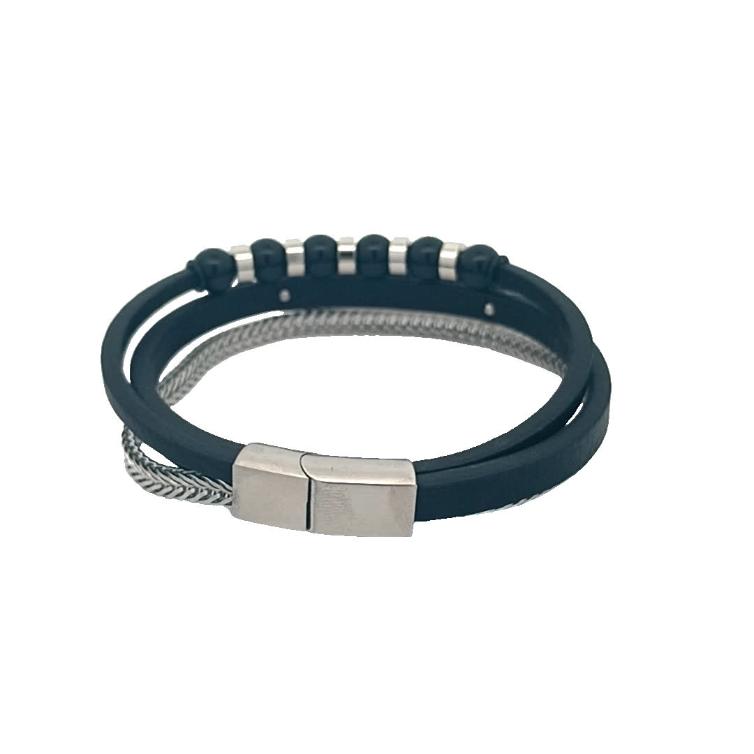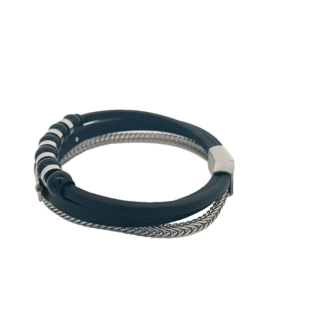 Podnieś poziom swoich dodatków dzięki tej stylowej czarno-srebrnej bransoletce. Dzięki unikalnemu połączeniu skóry i metalu oferuje nowoczesny zwrot akcji w klasycznym wzornictwie. Idealna zarówno na okazje codzienne, jak i formalne, ta bransoletka jest niezbędnym dodatkiem do Twojej kolekcji biżuterii.