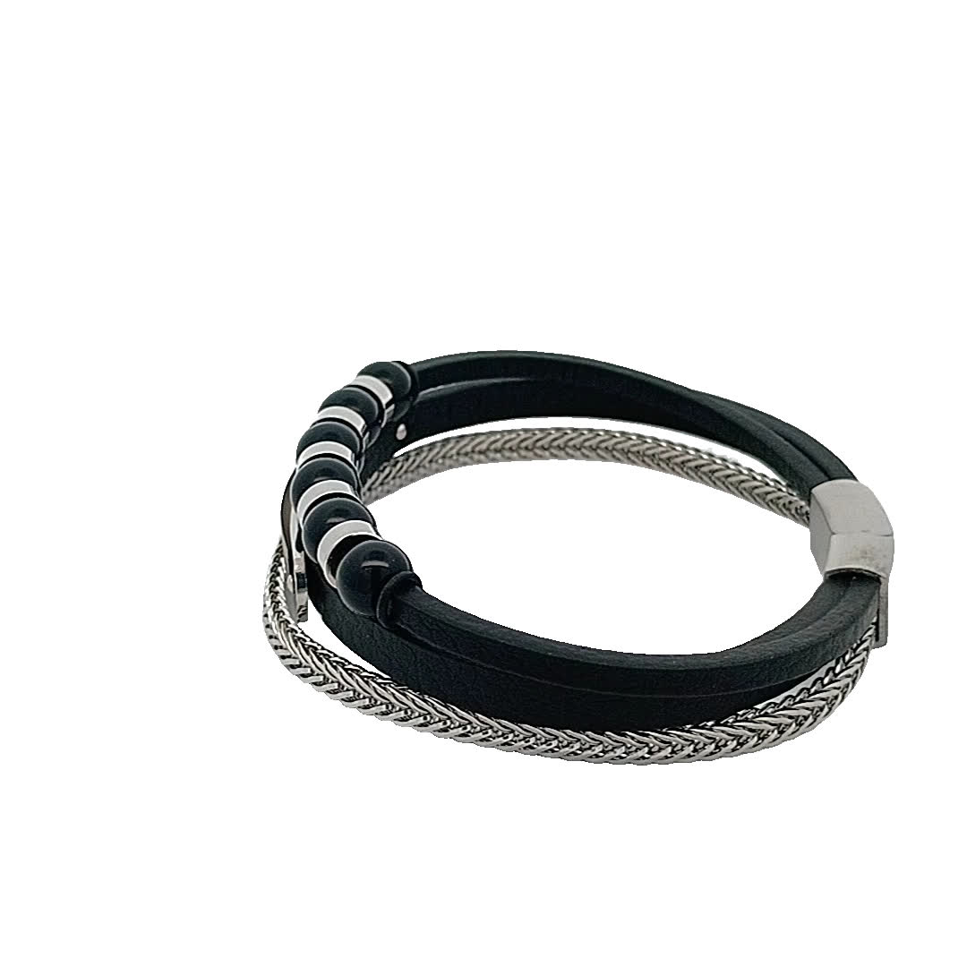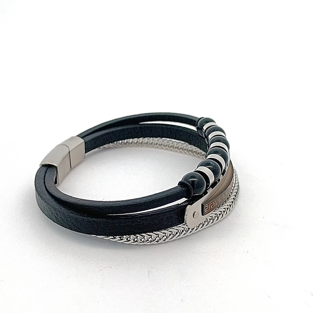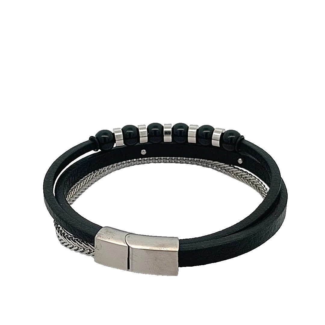 Podnieś poziom swoich dodatków dzięki tej stylowej czarnej skórzanej bransoletce. Ta wyjątkowa mieszanka eleganckich posrebrzanych akcentów i efektownych czarnych koralików doskonale sprawdzi się zarówno na co dzień, jak i na formalne okazje. Regulowana konstrukcja zapewnia wygodne dopasowanie do każdego rozmiaru nadgarstka.