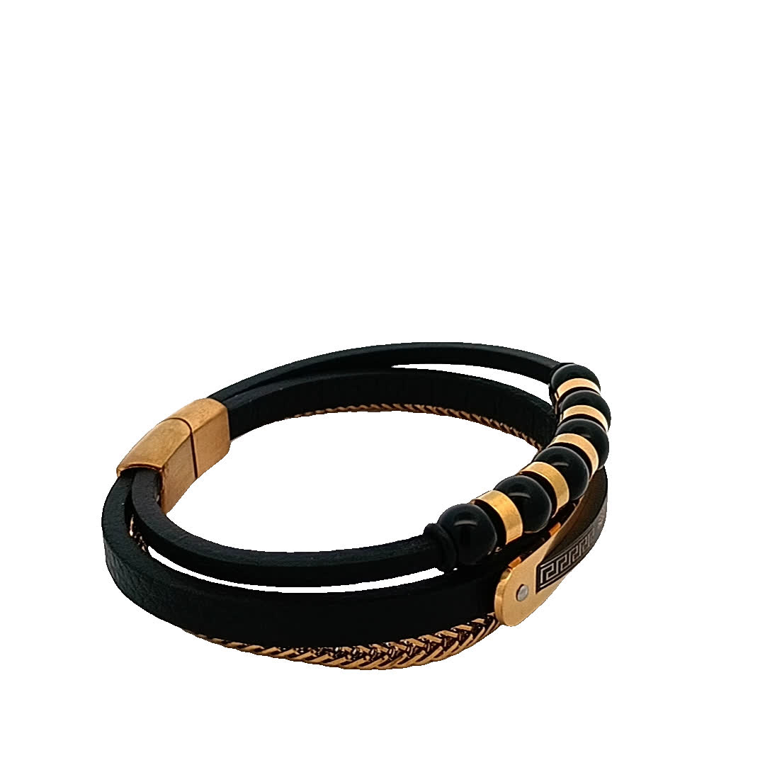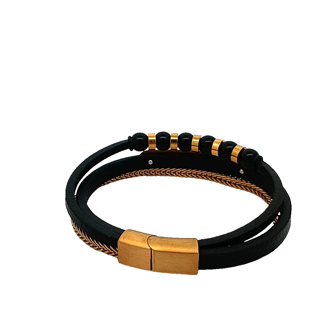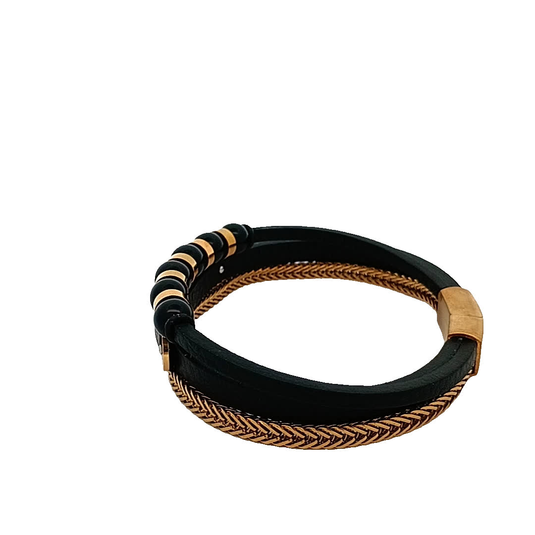 Podnieś poziom swoich dodatków dzięki tej oszałamiającej czarno-złoconej bransoletce. Dzięki unikalnej mieszance skóry i metalu łączy elegancję z nowoczesnym akcentem. Idealna zarówno na okazje codzienne, jak i formalne, ta część garderoby została zaprojektowana tak, aby zrobić wrażenie.