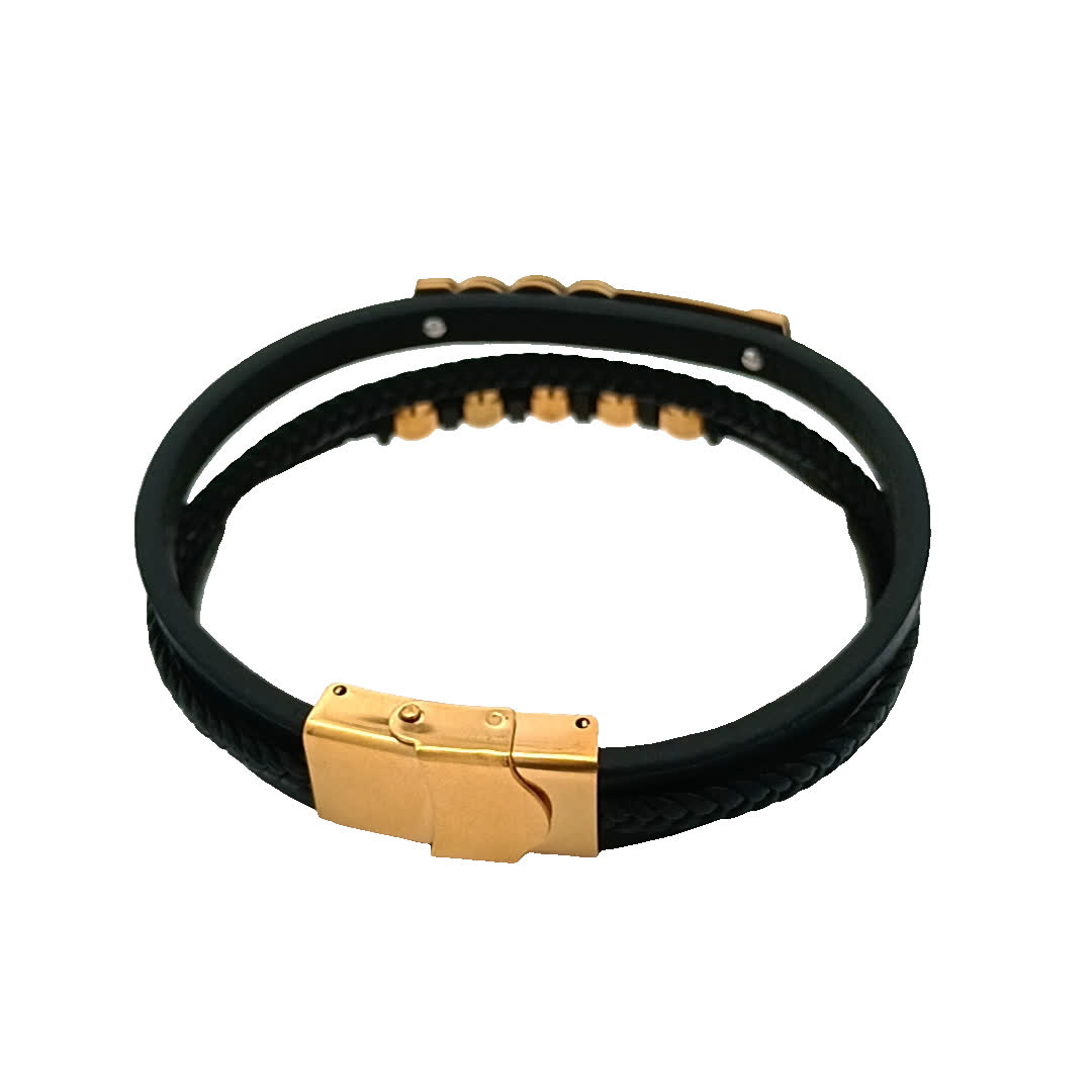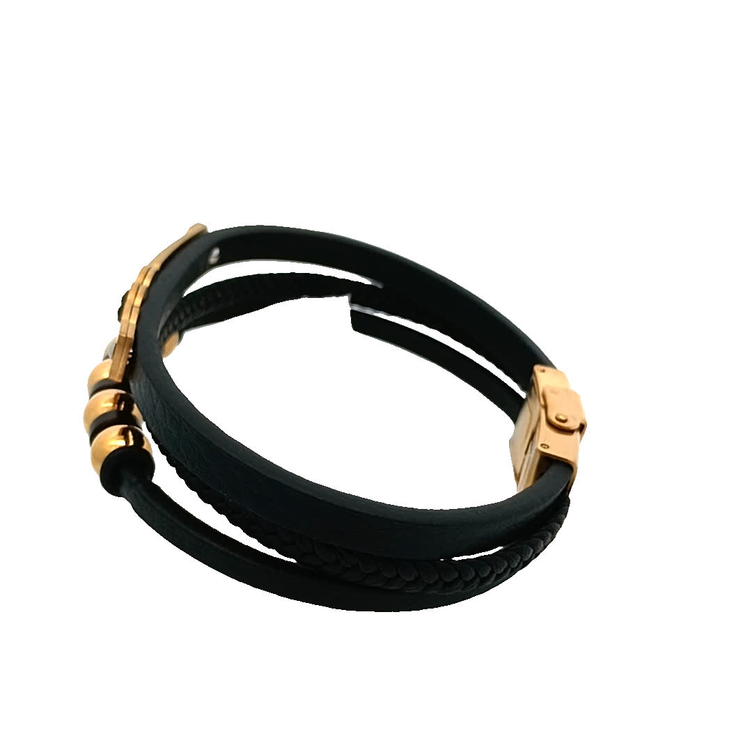 Podnieś poziom swoich dodatków dzięki tej szykownej czarno-złoconej bransoletce. Dzięki unikalnemu połączeniu plecionej skóry i polerowanych metalowych akcentów idealnie nadaje się zarówno na okazje codzienne, jak i formalne. Regulowane zapięcie zapewnia wygodne dopasowanie, dzięki czemu jest wszechstronnym dodatkiem do każdej kolekcji biżuterii.