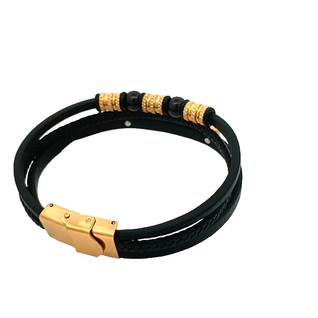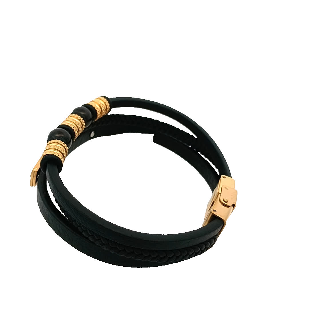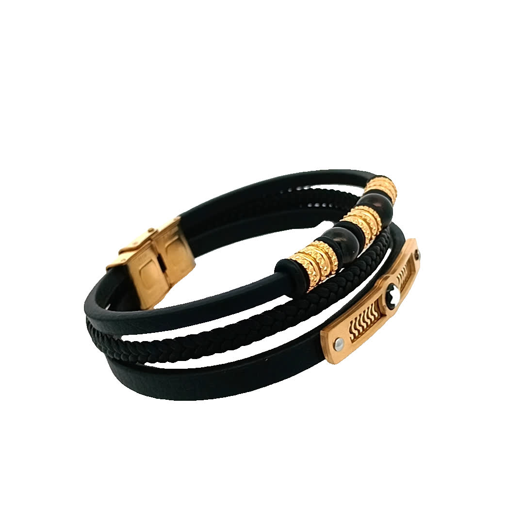 Podnieś poziom swoich dodatków dzięki tej oszałamiającej czarno-złoconej bransoletce. Wykonana z połączenia skóry i metalu, charakteryzuje się misternymi detalami, które dodają odrobinę wyrafinowania do każdej stylizacji. Idealna zarówno na okazje codzienne, jak i formalne, ta bransoletka jest niezbędnym dodatkiem do Twojej kolekcji biżuterii.