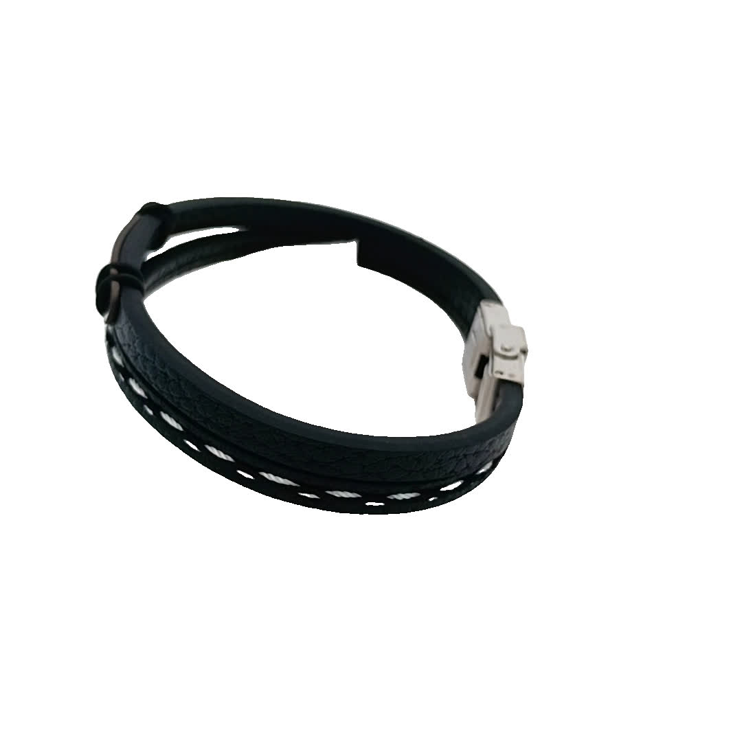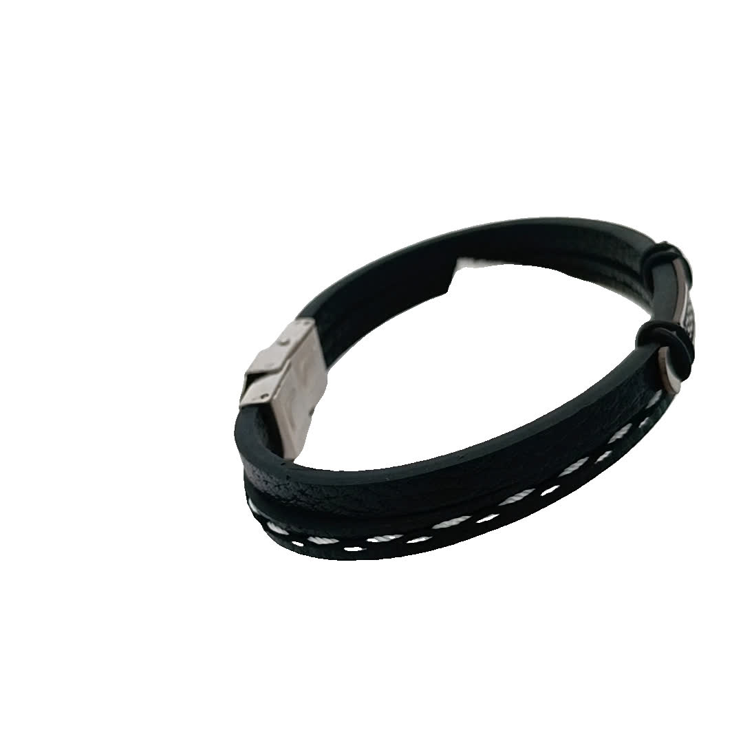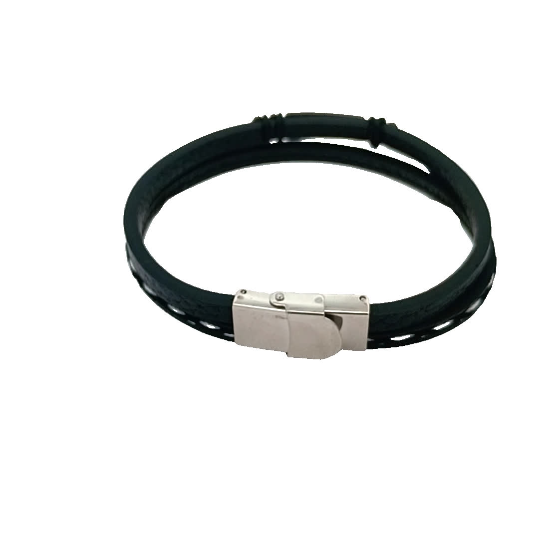 Podnieś poziom swoich dodatków dzięki tej stylowej czarnej skórzanej bransoletce. Dzięki wyjątkowemu wzornictwu z efektownym posrebrzanym zapięciem bez wysiłku łączy nowoczesną estetykę z ponadczasową elegancją. Idealna zarówno na okazje codzienne, jak i formalne, ta bransoletka jest niezbędnym dodatkiem do Twojej kolekcji biżuterii.