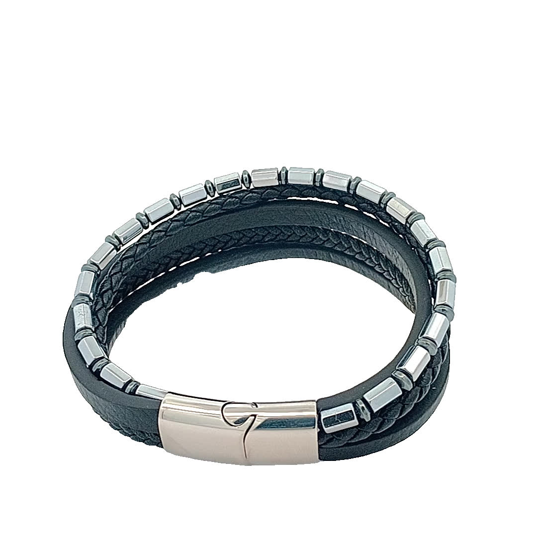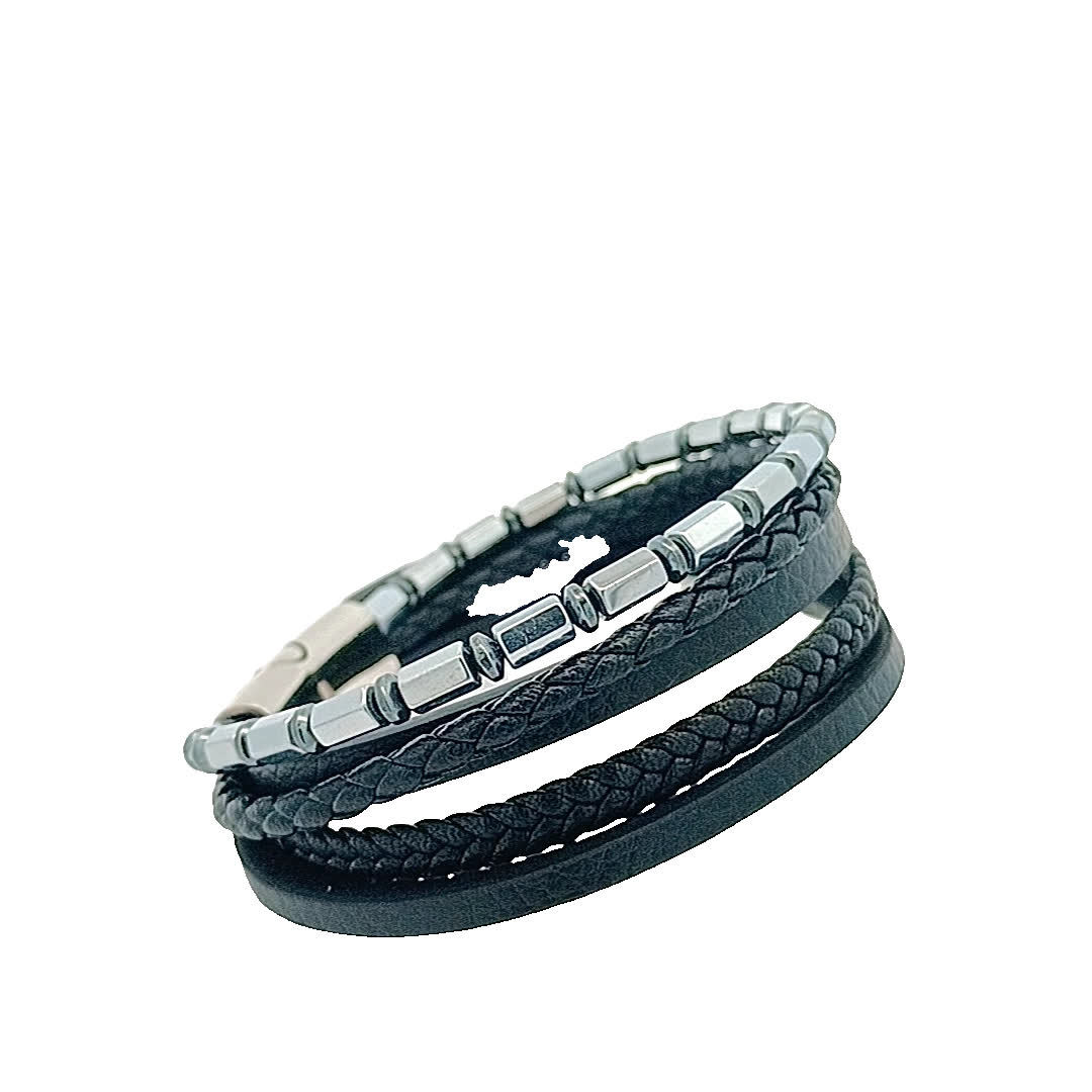 Podnieś poziom swoich dodatków dzięki tej stylowej, wielowarstwowej skórzanej bransoletce. Łącząc w sobie eleganckie skórzane i metalowe akcenty, dodaje odrobinę wyrafinowania do każdego stroju. Idealna zarówno na okazje codzienne, jak i formalne, ta bransoletka to must-have dla entuzjastów mody.