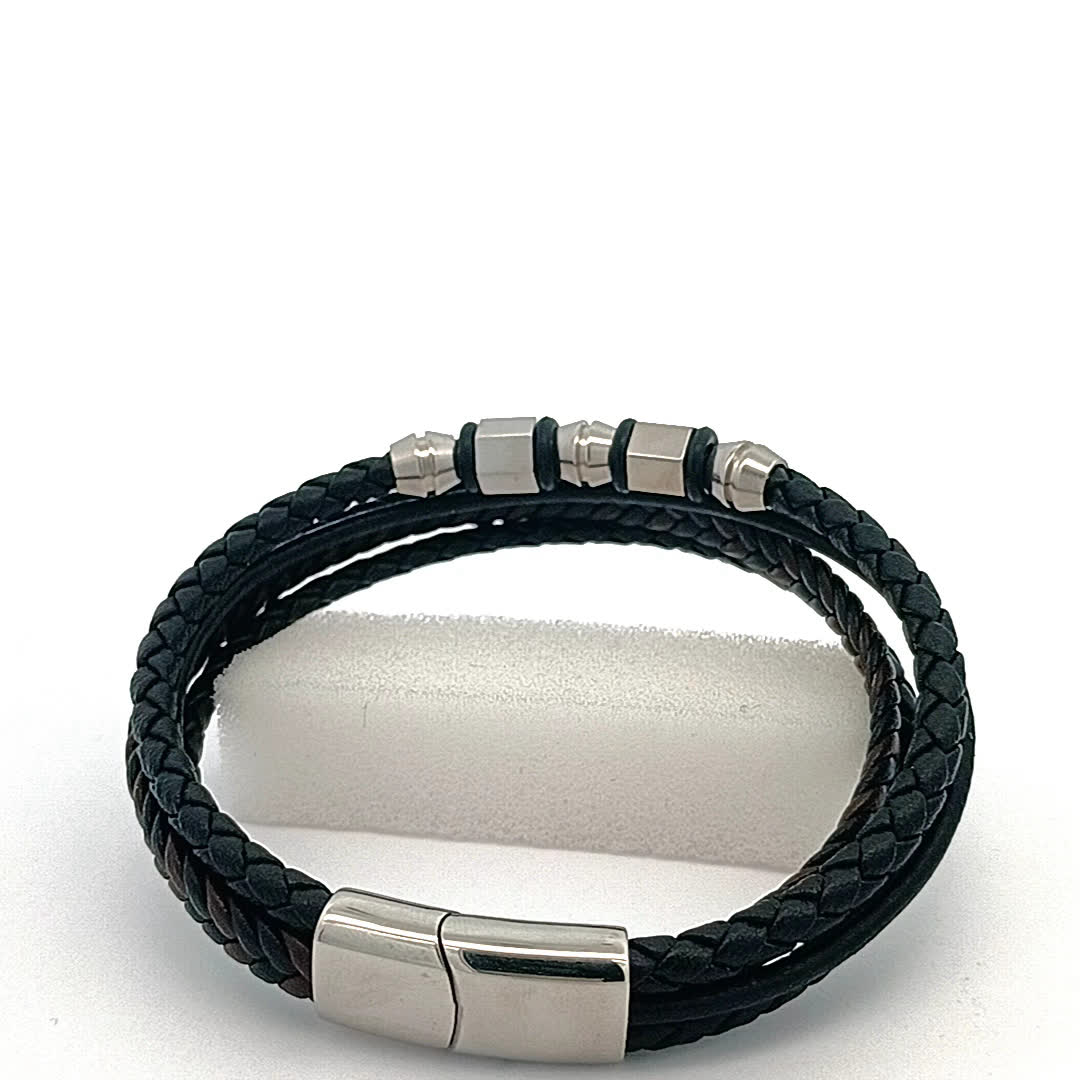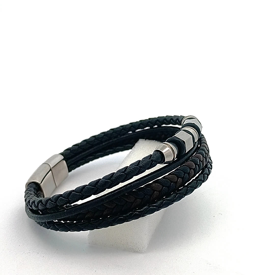 Ta stylowa czarna skórzana bransoletka ma wyjątkowy pleciony wzór, idealny do dodania odrobiny wyrafinowania do każdego stroju. Połączenie eleganckich metalowych akcentów i wytrzymałej skóry sprawia, że jest to wszechstronny dodatek zarówno na okazje codzienne, jak i formalne.