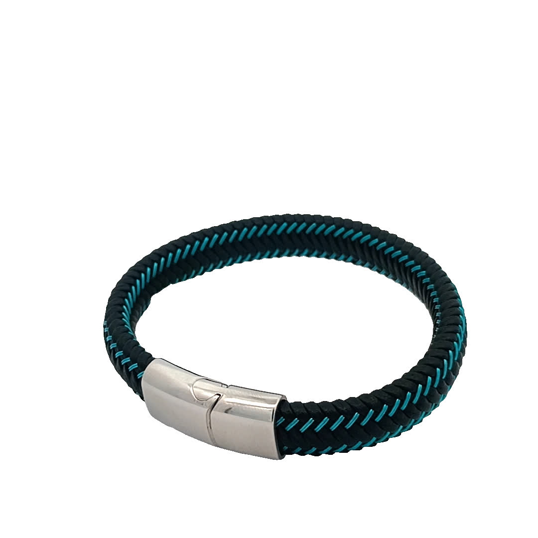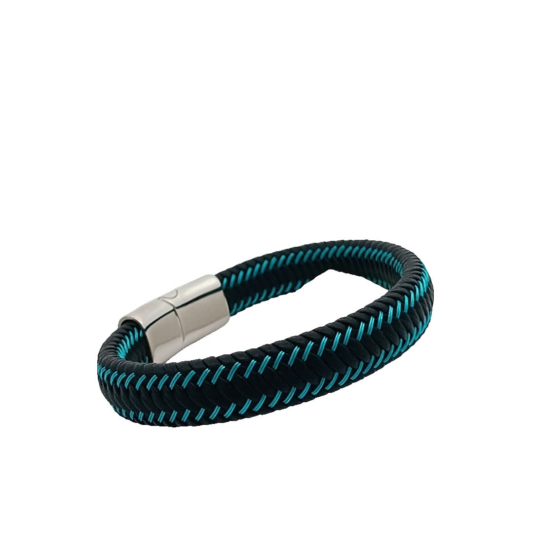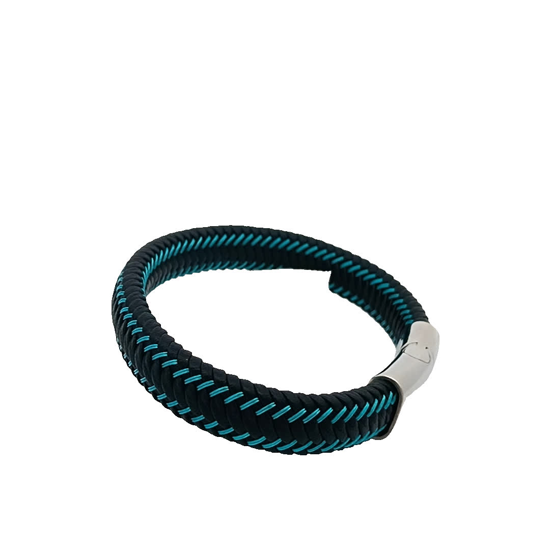 Podnieś poziom swoich dodatków dzięki tej stylowej bransoletce w kolorze niebiesko-czarnym. Wykonana z unikalnym plecionym wzorem, dodaje odrobinę nowoczesnej elegancji do każdego stroju. Idealna zarówno na okazje codzienne, jak i formalne, ta bransoletka jest pozycją obowiązkową dla entuzjastów mody.