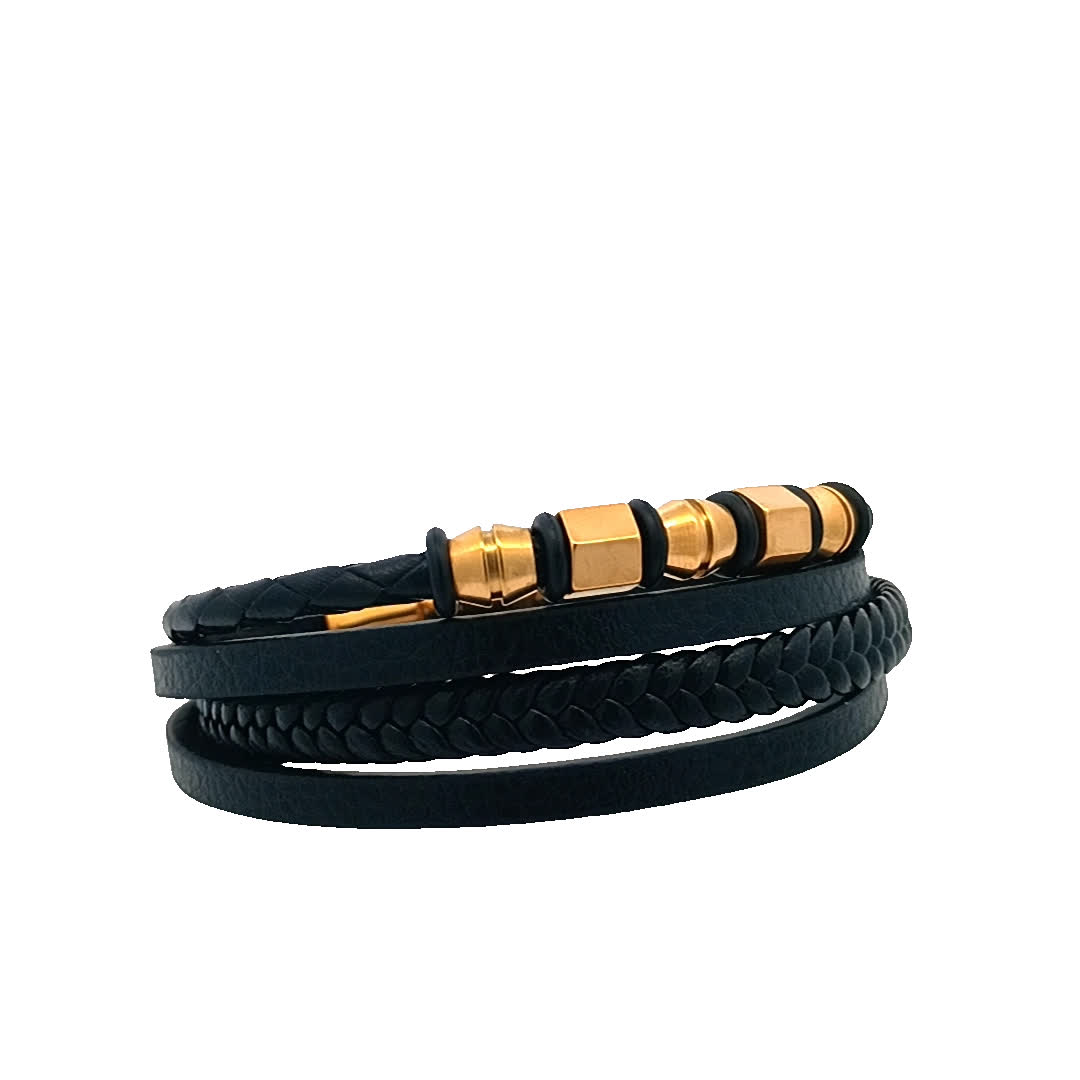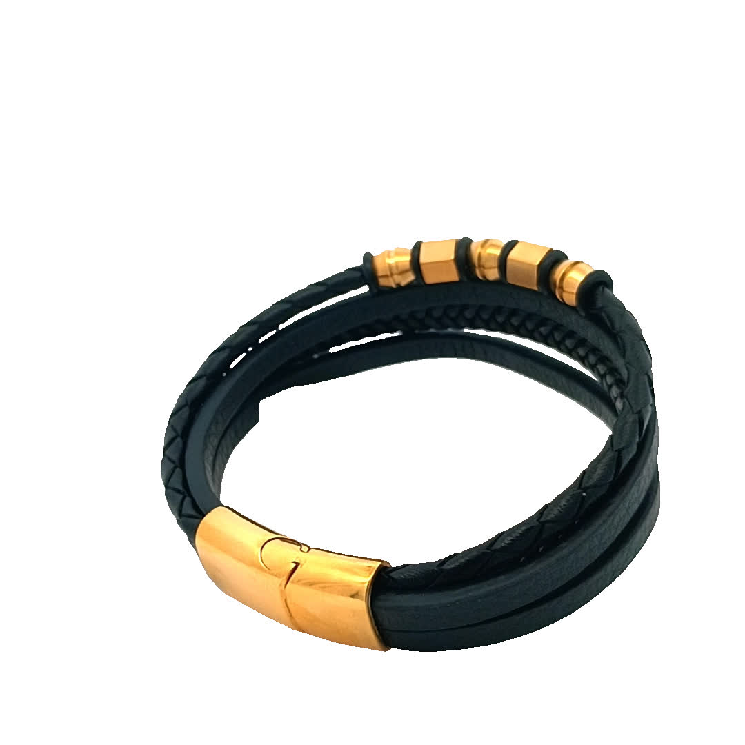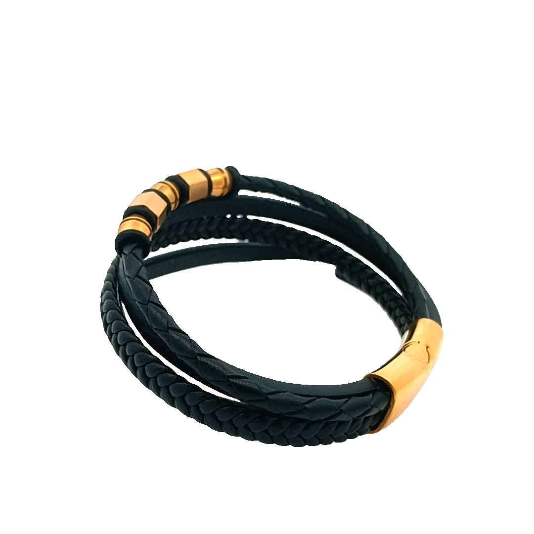 Podnieś poziom swoich dodatków dzięki tej stylowej bransoletce ze skóry i złocona. Dzięki unikalnemu połączeniu plecionej skóry i eleganckich złoconych akcentów doda odrobinę wyrafinowania każdej stylizacji. Ta bransoletka jest idealna zarówno na okazje codzienne, jak i formalne, a entuzjaści mody muszą ją mieć.