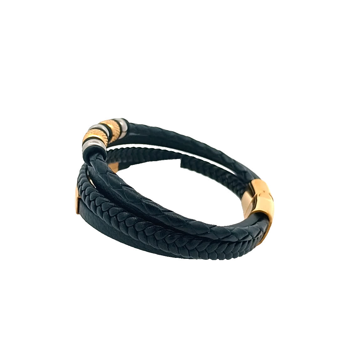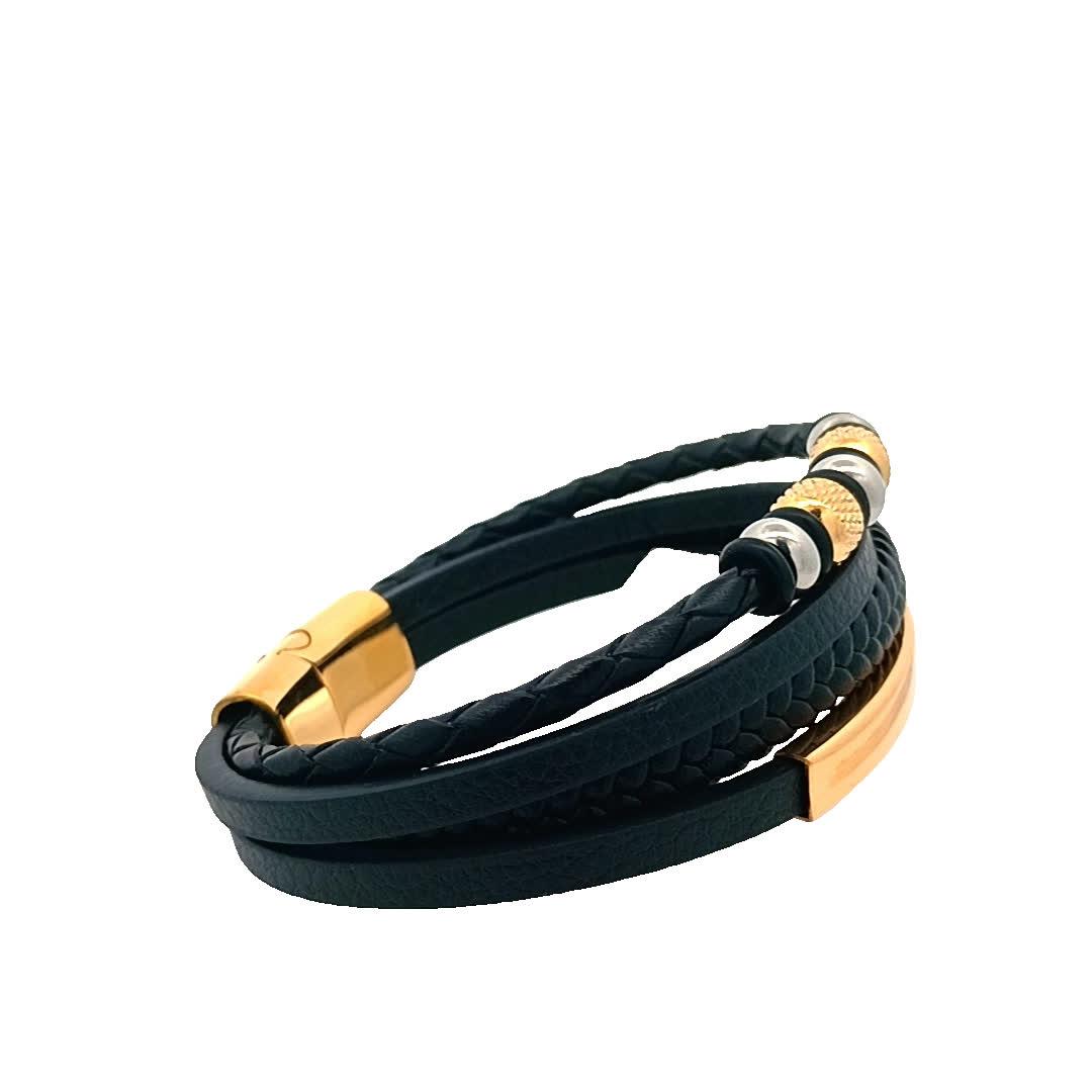Podnieś poziom swoich dodatków dzięki tej stylowej czarnej skórzanej bransoletce. Dzięki unikalnemu połączeniu plecionych i gładkich tekstur doda odrobinę wyrafinowania każdej stylizacji. złocone akcenty zapewniają uderzający kontrast, dzięki czemu jest to idealny element zarówno na okazje codzienne, jak i formalne.