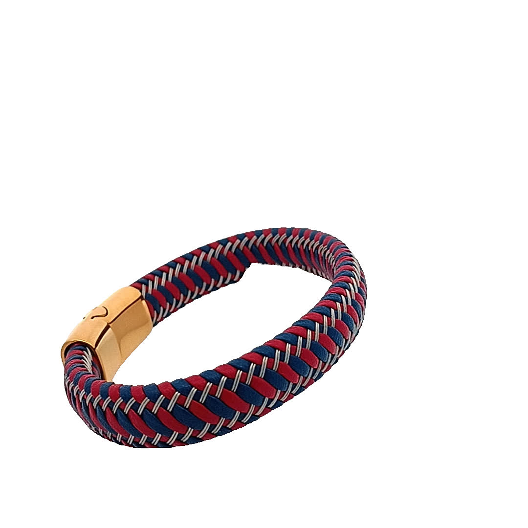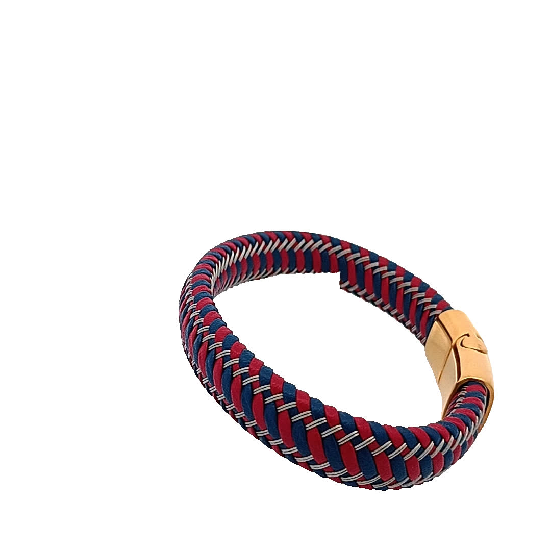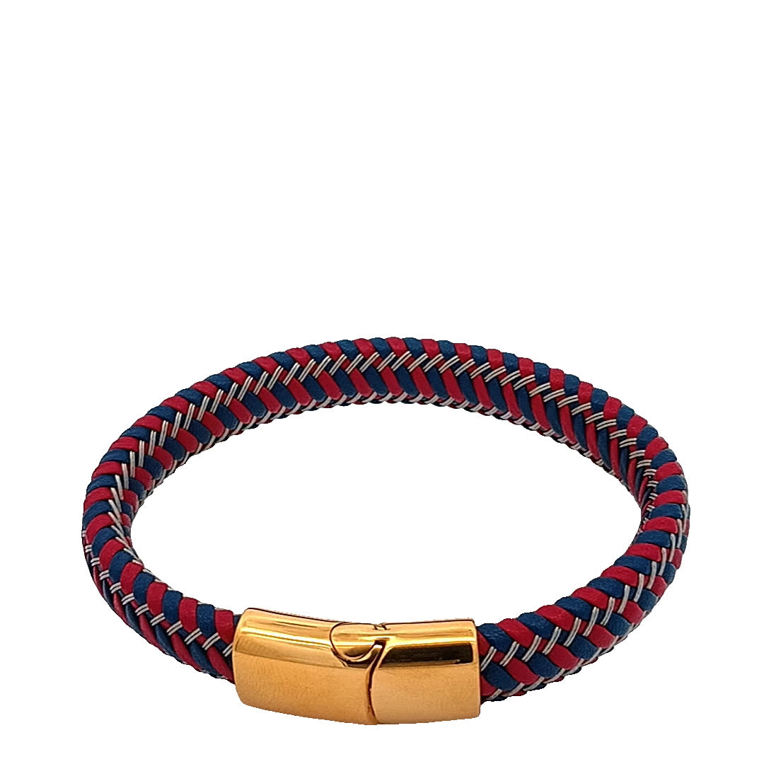 Ta żywa pleciona bransoletka charakteryzuje się uderzającą kombinacją czerwonych i niebieskich nici, fachowo splecionych ze sobą, aby uzyskać wyjątkowy wygląd. złocone zapięcie dodaje odrobinę elegancji, dzięki czemu bransoletka idealnie nadaje się zarówno na okazje codzienne, jak i formalne. Podnieś poziom swoich dodatków dzięki temu przyciągającemu wzrok elementowi, który uwydatnia Twój osobisty styl.