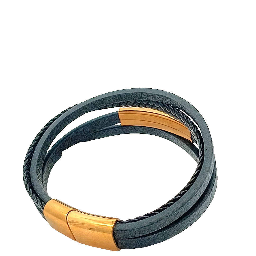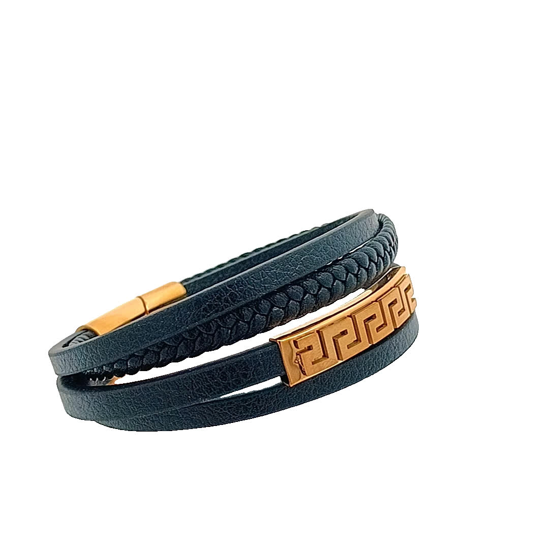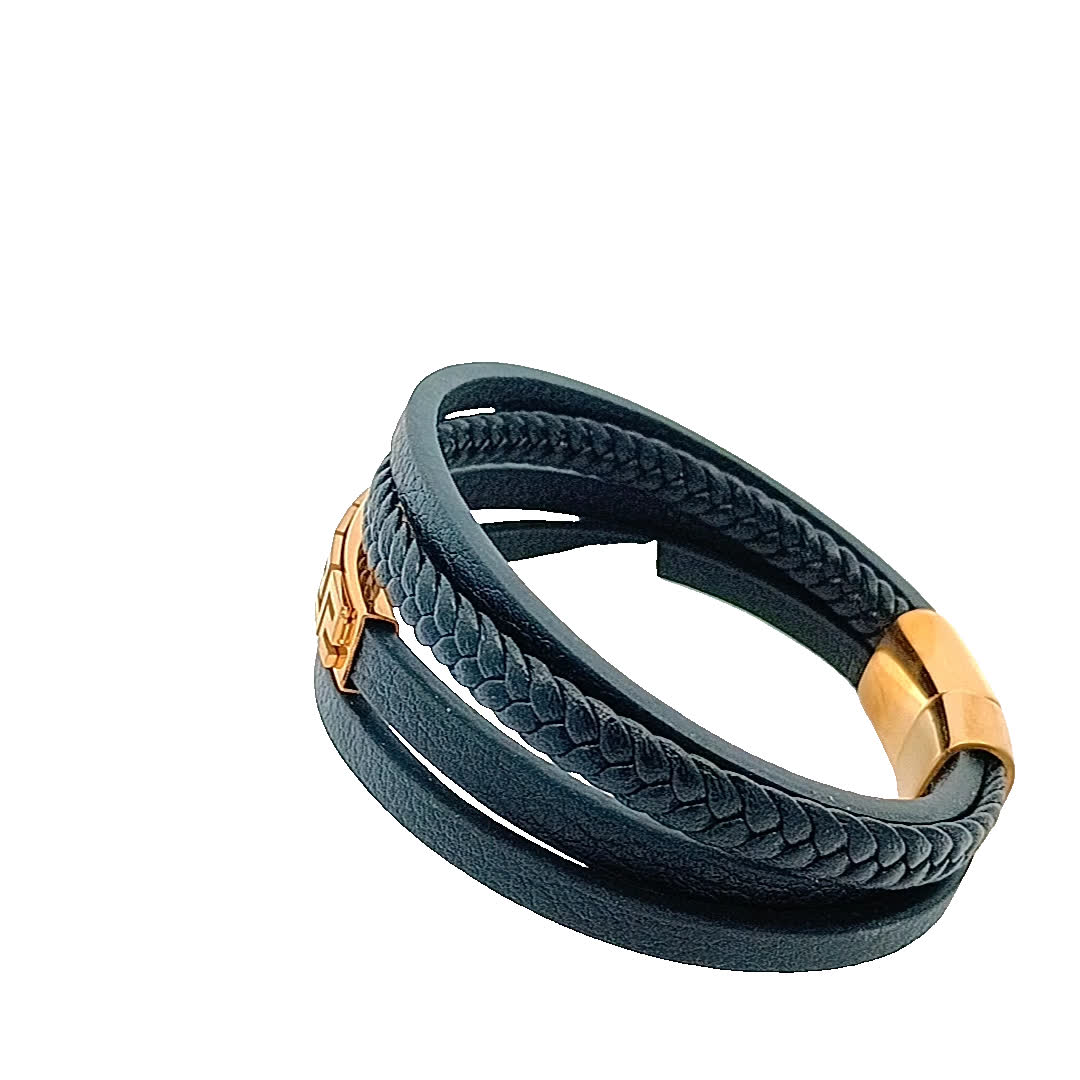 Ta oszałamiająca czarna skórzana bransoletka ma wyjątkowy pleciony wzór, uzupełniony uderzającym złocistym akcentem. Idealna do dodania odrobiny wyrafinowania do każdego stroju, bez wysiłku łączy styl casualowy i szykowny. Noś ją samodzielnie lub zestaw z innymi bransoletkami, aby uzyskać modny, warstwowy wygląd.