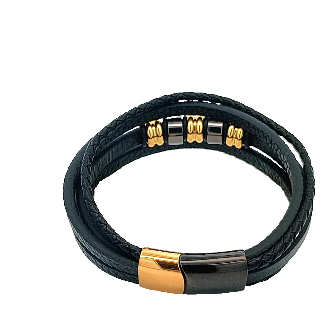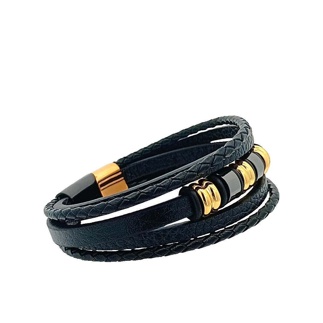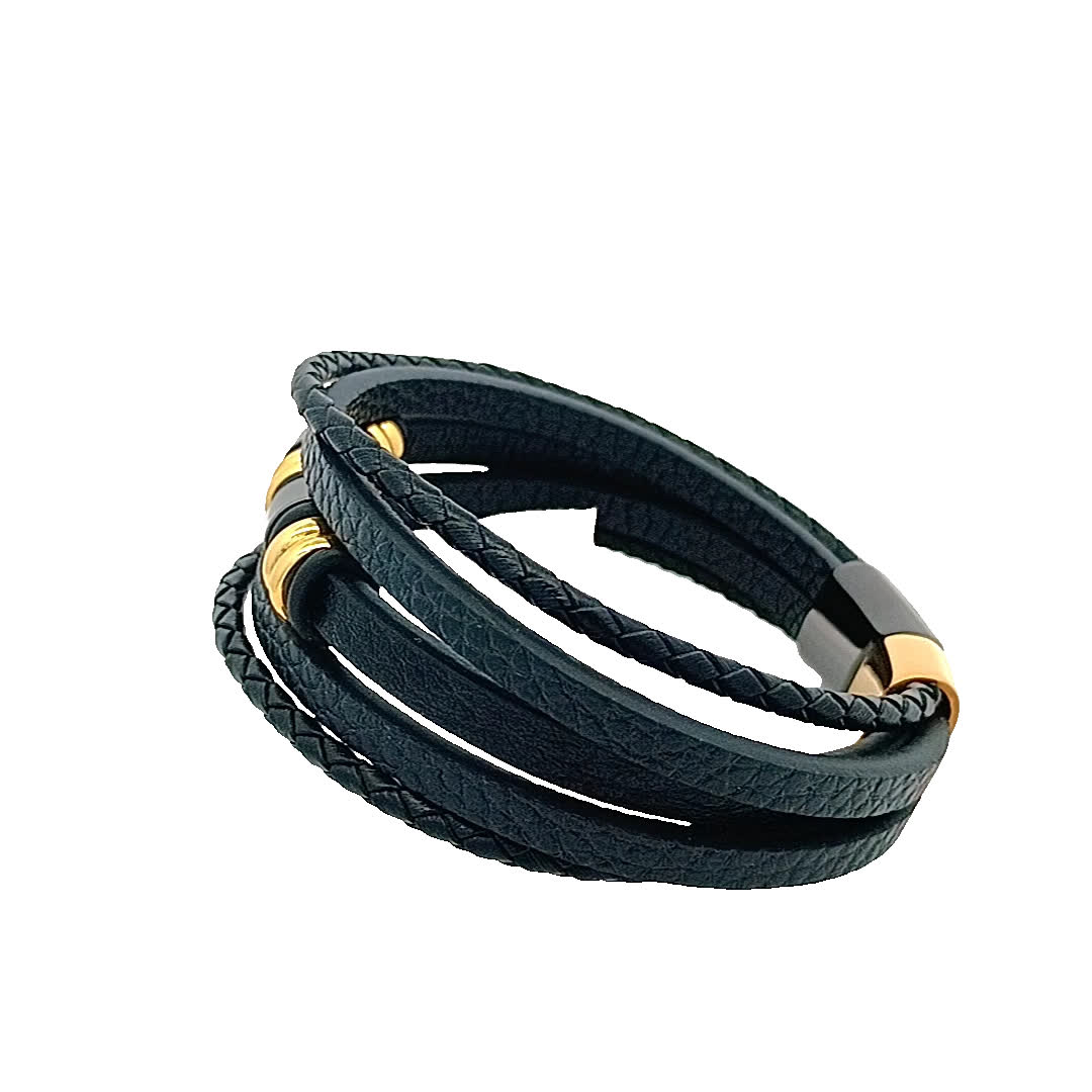 Ta oszałamiająca czarna skórzana bransoletka owijana wyróżnia się wyjątkowym wzorem, który łączy elegancję z nowoczesnym akcentem. Misterna pleciona faktura i złocone akcenty tworzą uderzający kontrast, dzięki czemu jest idealnym dodatkiem zarówno do codziennych, jak i formalnych strojów. Ulepsz swoją kolekcję biżuterii dzięki temu wszechstronnemu elementowi, który doda odrobinę wyrafinowania do każdego wyglądu.