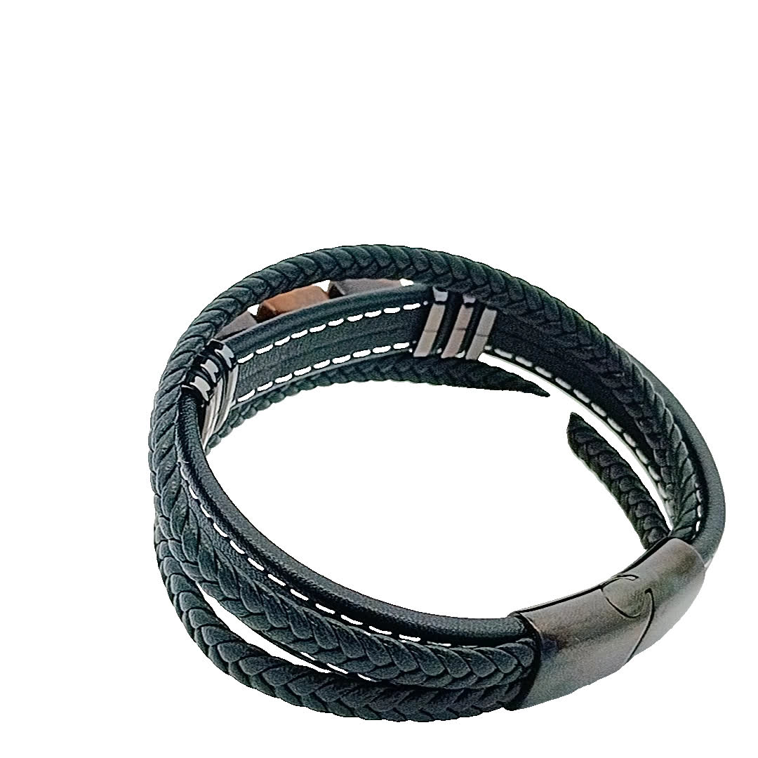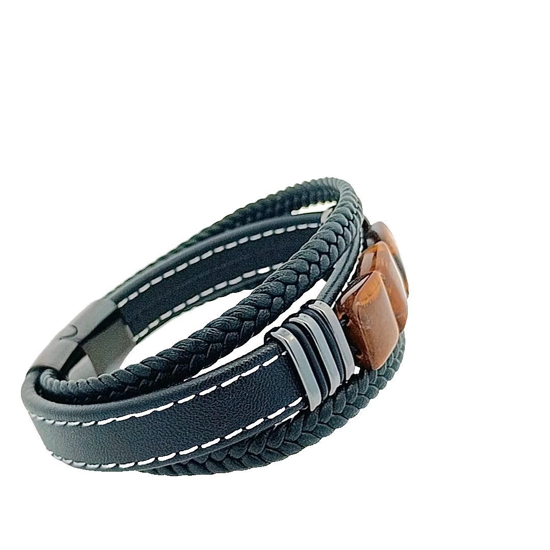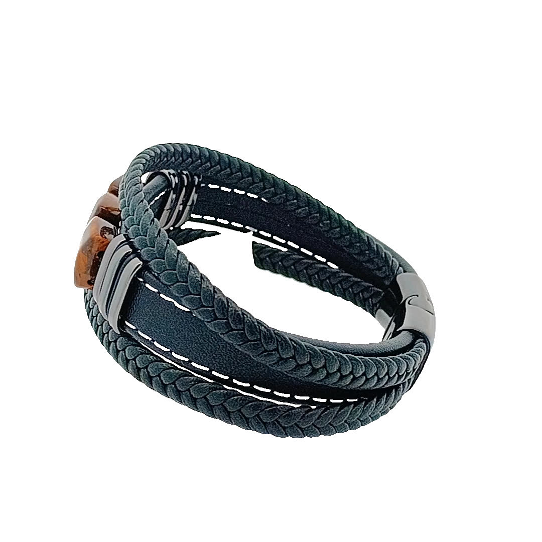 Ta wykwintna bransoletka łączy w sobie surowy urok plecionej skóry z naturalnym pięknem polerowanych kamieni. Ziemiste odcienie kamieni tygrysiego oka dodają odrobinę elegancji, dzięki czemu jest idealnym dodatkiem zarówno do swobodnych, jak i formalnych strojów.