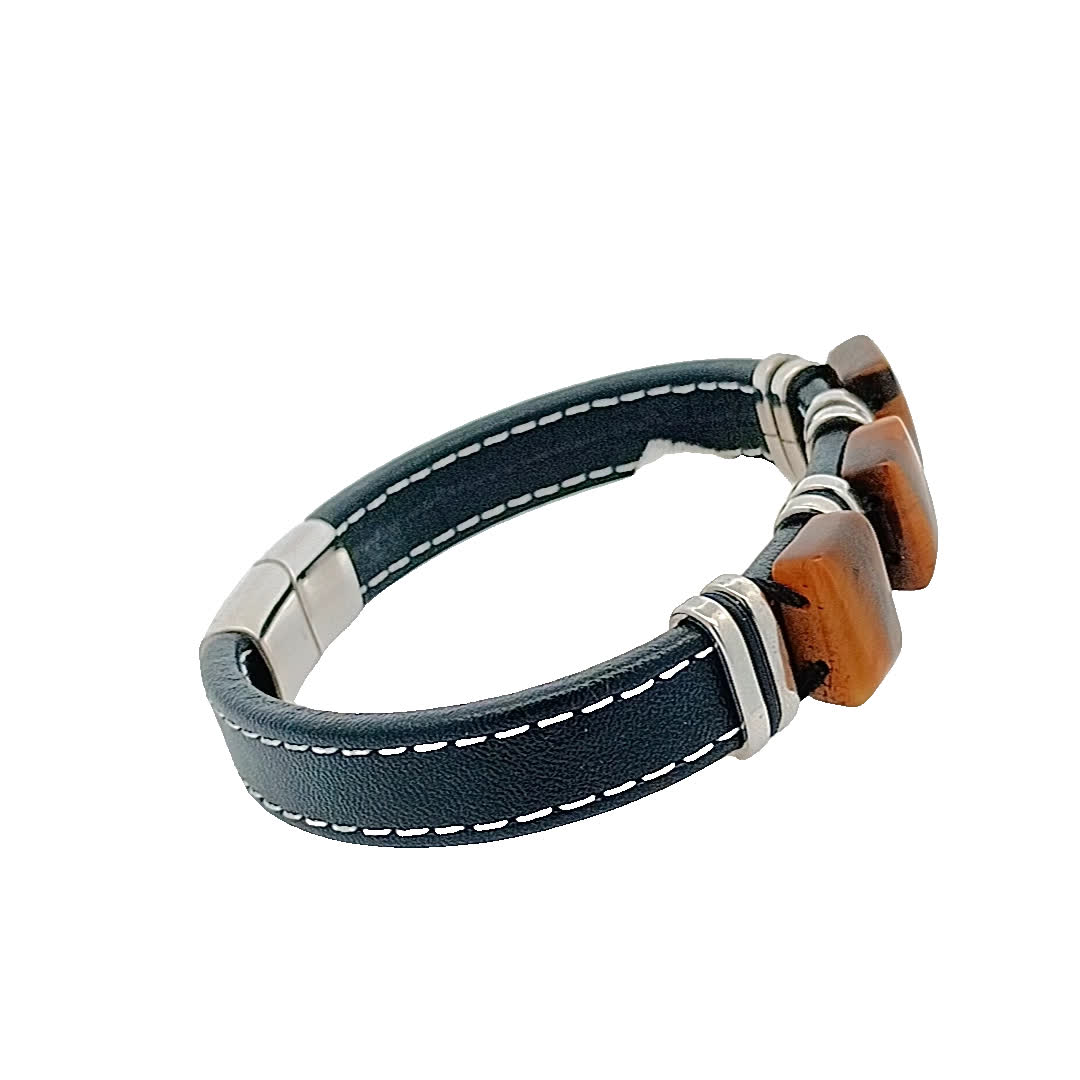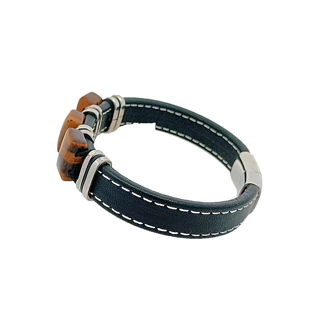 Podnieś poziom swoich dodatków dzięki tej stylowej skórzanej bransoletce z efektownymi kamieniami tygrysiego oka. Połączenie bogatych brązowych odcieni i eleganckich posrebrzanych akcentów tworzy nowoczesny, a zarazem ponadczasowy wygląd, idealny na każdą okazję. Niezależnie od tego, czy ubierasz się na wieczorne wyjście, czy dodajesz szyku swojemu codziennemu strojowi, ta bransoletka jest niezbędnym dodatkiem do Twojej kolekcji biżuterii.