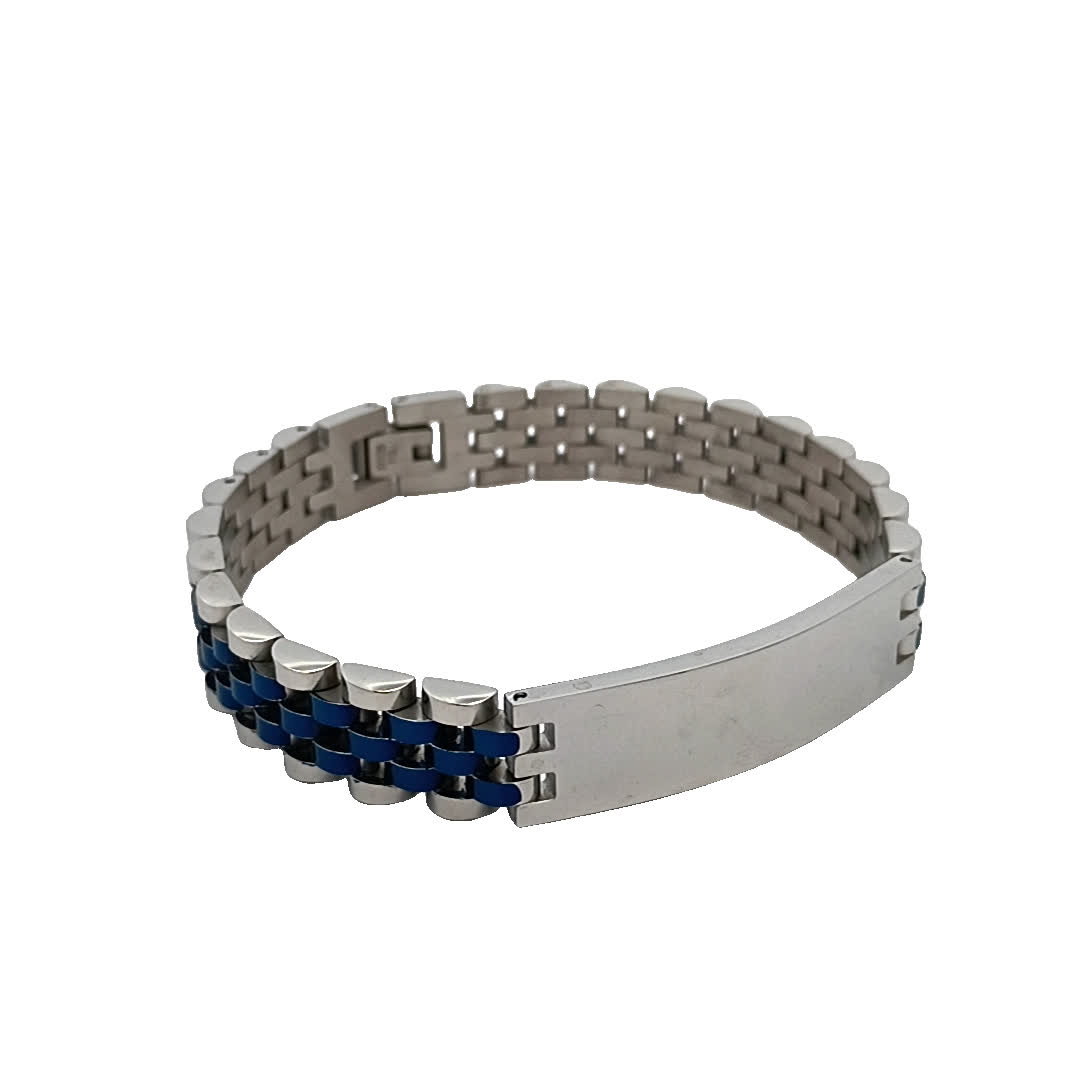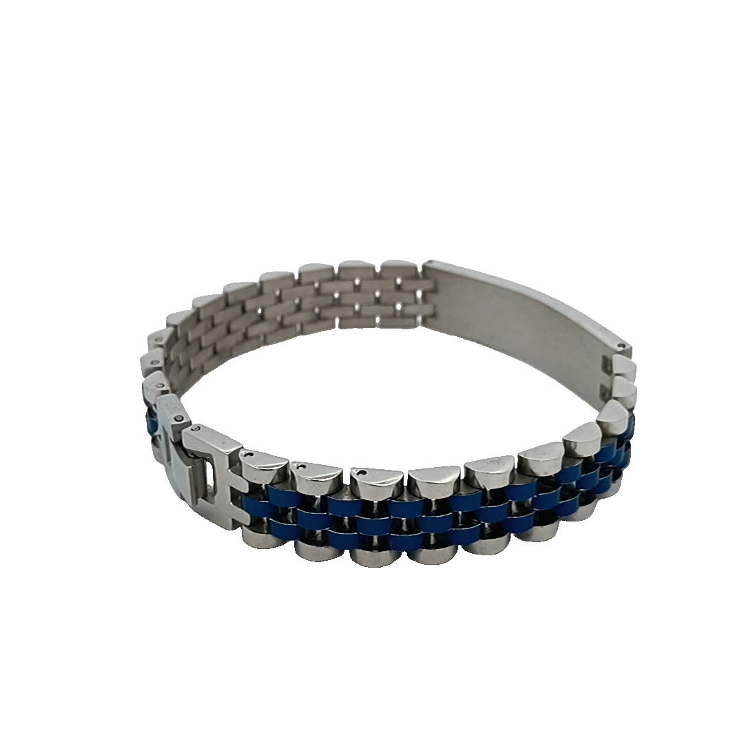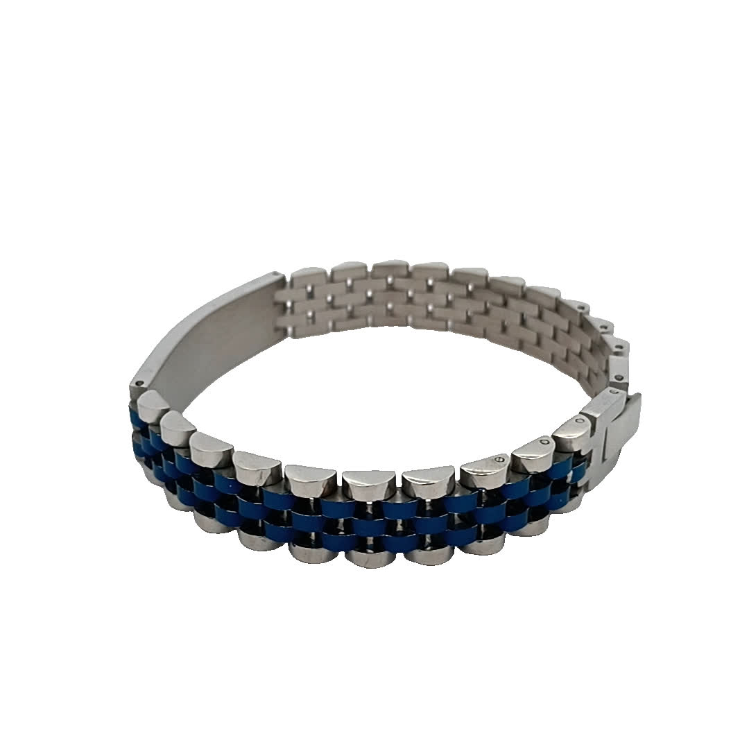 Ta oszałamiająca bransoletka ma elegancki posrebrzany design uzupełniony żywymi niebieskimi akcentami. Idealna zarówno na okazje codzienne, jak i formalne, dodaje odrobinę elegancji do każdego stroju. Regulowane dopasowanie zapewnia wygodę, jednocześnie stanowiąc odważne oświadczenie modowe.