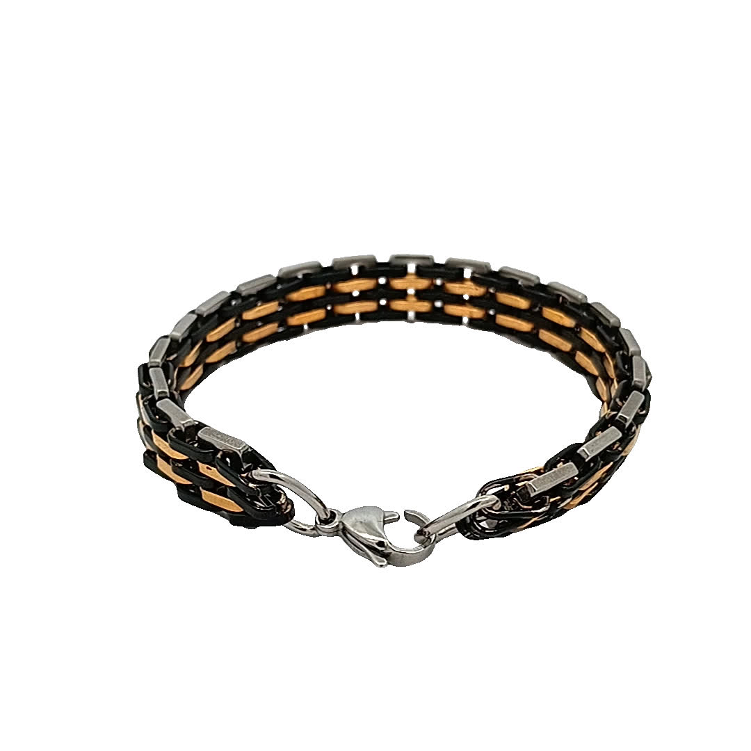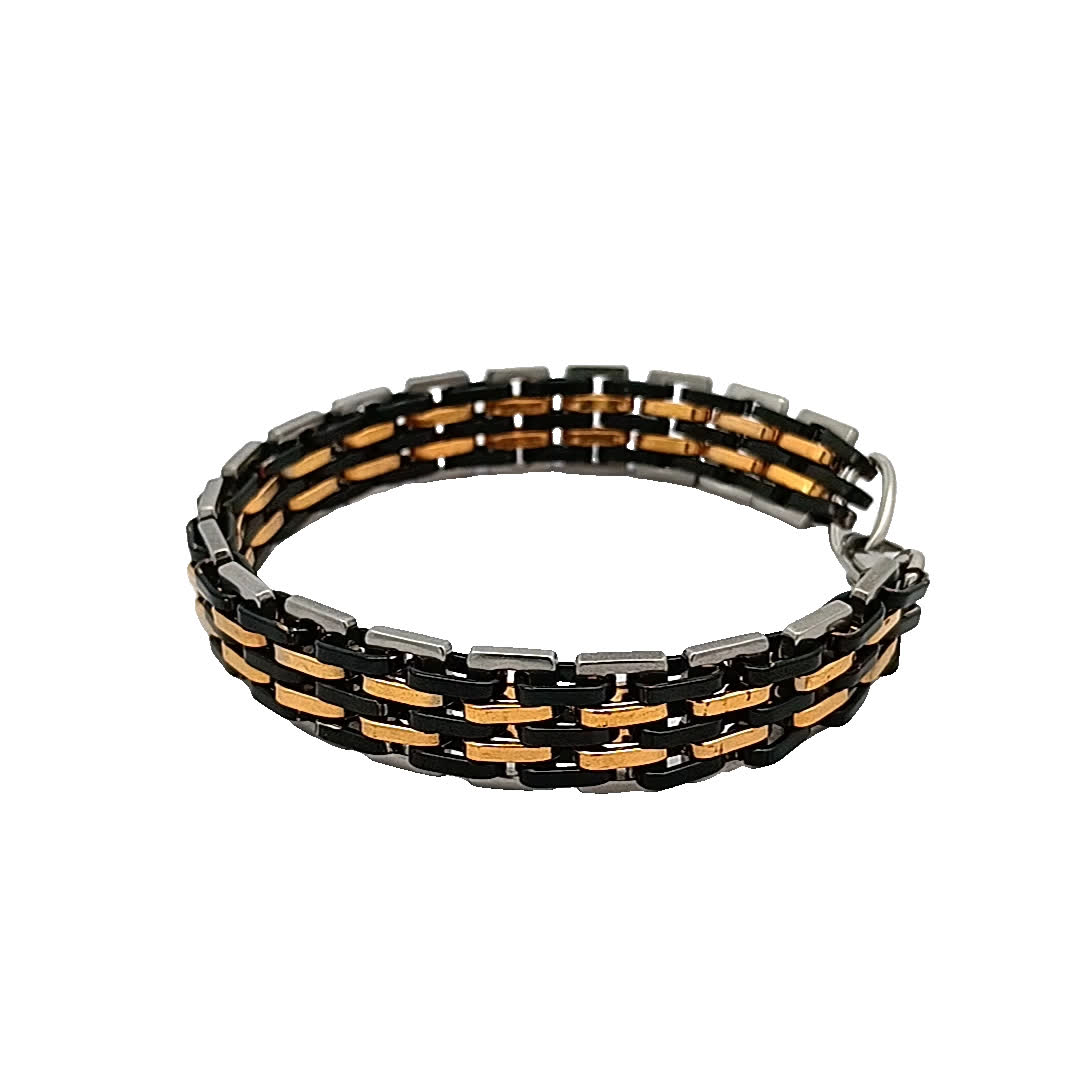 Podnieś poziom swoich dodatków dzięki tej oszałamiającej czarno-złoconej bransoletce. Jej wyjątkowy design charakteryzuje się naprzemiennymi ogniwami, które tworzą odważny, ale elegancki wygląd, idealny na każdą okazję. Niezależnie od tego, czy ubierasz się na wieczorne wyjście, czy dodajesz szyku swojemu codziennemu strojowi, ta bransoletka jest niezbędnym dodatkiem do Twojej kolekcji biżuterii.