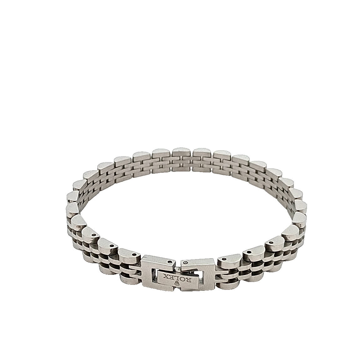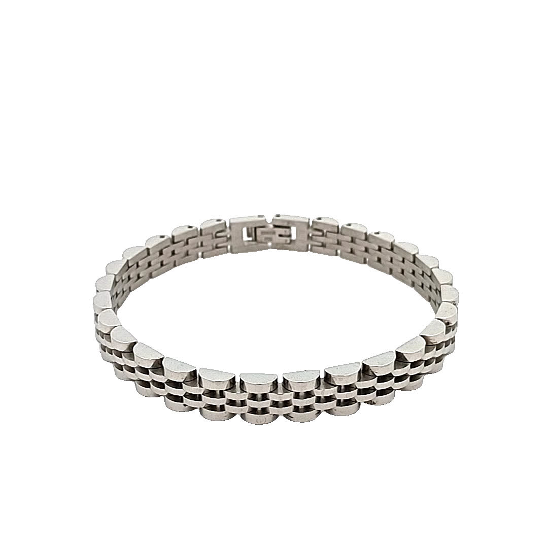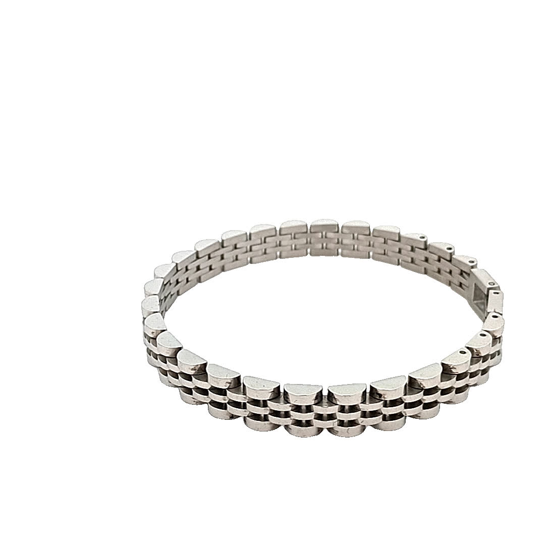 Odkryj ponadczasową elegancję tej srebrnej bransoletki, zaprojektowanej tak, aby uzupełniała każdy strój. Jej elegancki, nowoczesny design charakteryzuje się zazębiającymi się ogniwami, które tworzą wyrafinowany wygląd, idealny zarówno na okazje codzienne, jak i formalne.