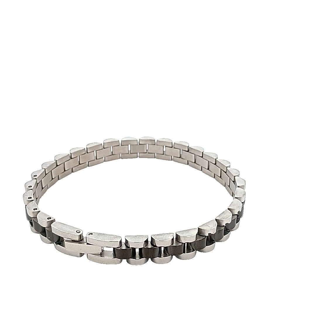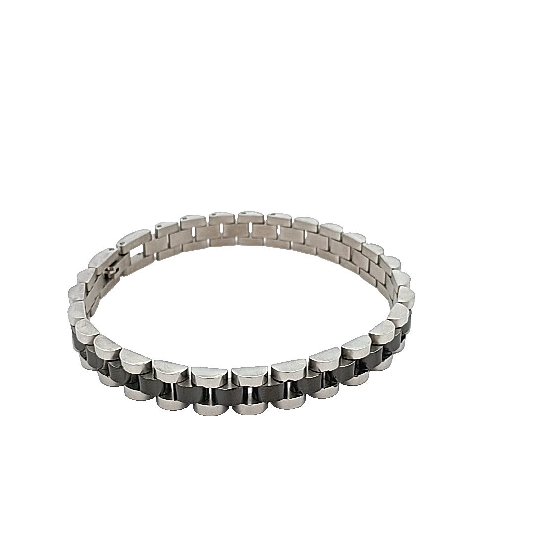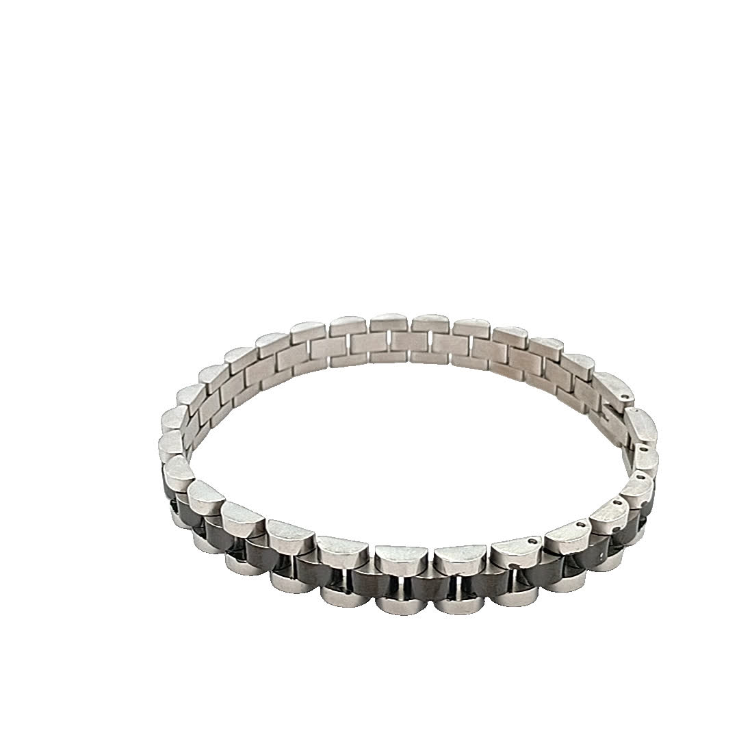 Ta oszałamiająca posrebrzana bransoletka ma elegancki design, który bez wysiłku łączy elegancję i nowoczesność. Jej naprzemienne polerowane i matowe wykończenie tworzy urzekający kontrast wizualny, dzięki czemu jest idealnym dodatkiem zarówno na okazje codzienne, jak i formalne.