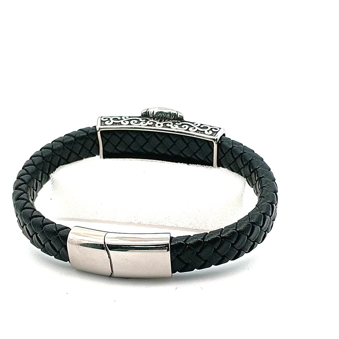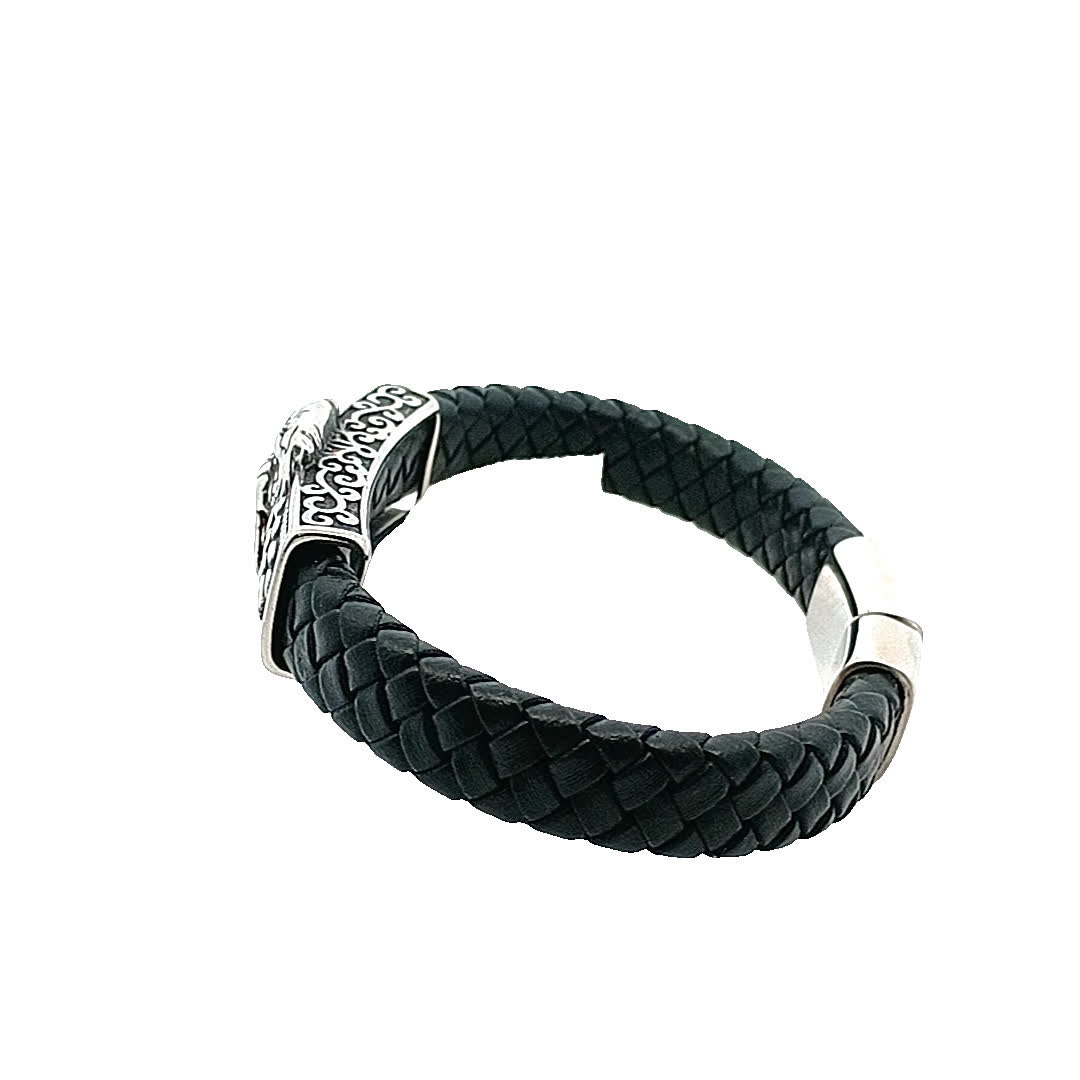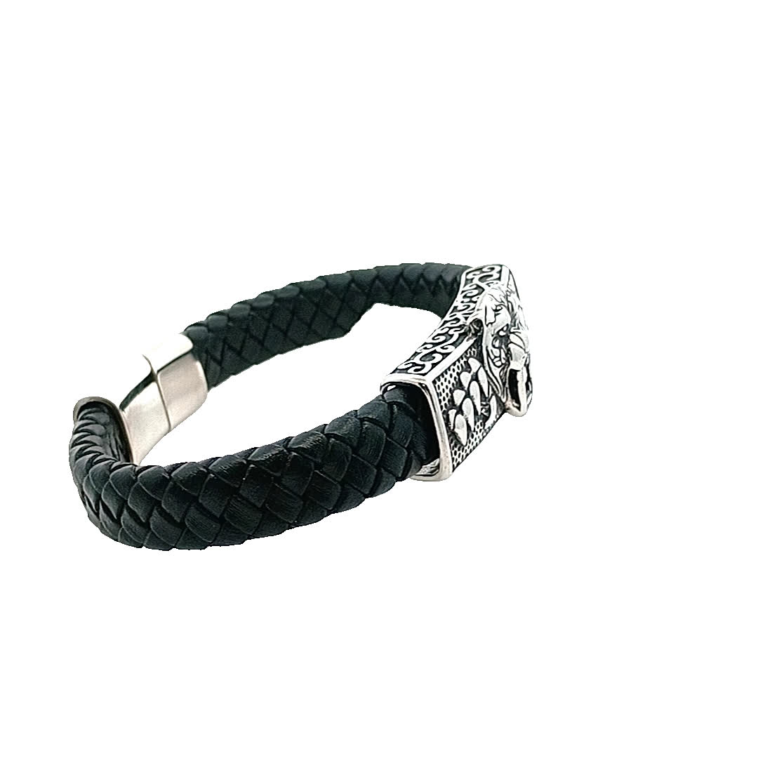 Ta efektowna czarna pleciona bransoletka ma odważne posrebrzane zapięcie ozdobione groźną głową lwa. Idealna do dodania odrobiny pazura do każdego stroju, łączy trwałość ze stylem. Niezależnie od tego, czy ubierasz się na wieczorne wyjście, czy wolisz swobodny styl, ta bransoletka jest wszechstronnym dodatkiem, który robi wrażenie.